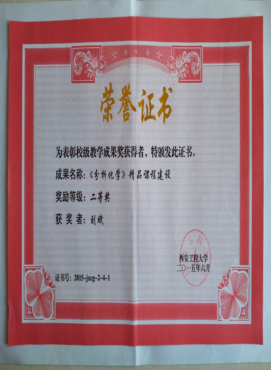 3. 2015年教学成果分析化学精品课程建设获校级二等奖;