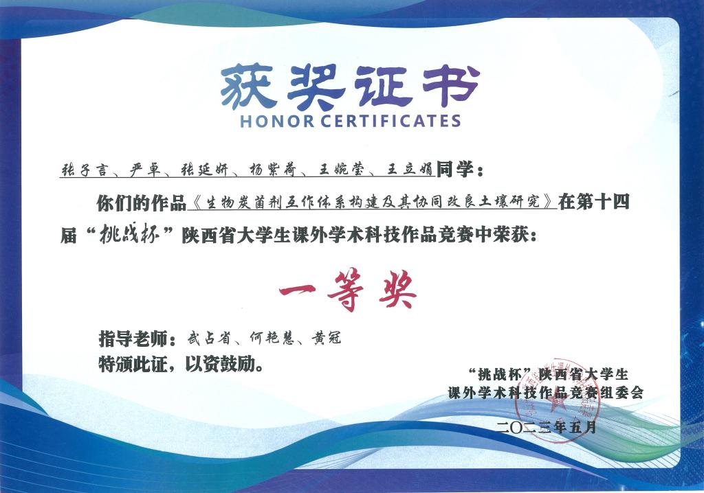 武占省教授、何艳慧老师指导的项目《生物炭菌剂互作体系构逆及其协同改良土壤研究》(参赛学生:张子言、严卓、张延妍、杨紫荷、王婉莹、王立娟)荣获一等奖。