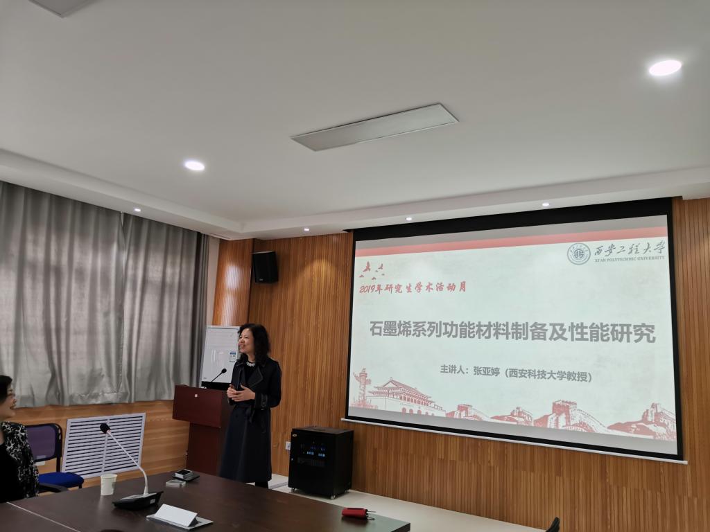 2019年11月7日下午,环化学院在507会议室举办了2019年研究生学术活动月活动,邀请西安科技大学教授张亚婷作了题为“石墨烯系列功能材料制备及性能研究”的学术报告。环化学院研一、研二学生参加了本次报告,报告会由学院副院长常薇主持。