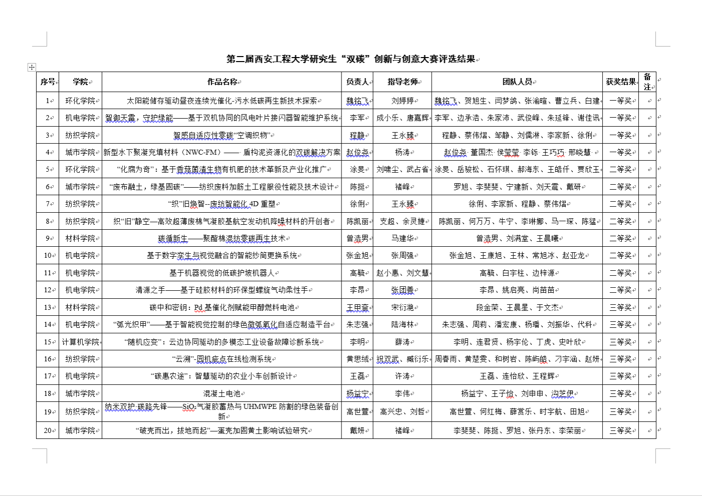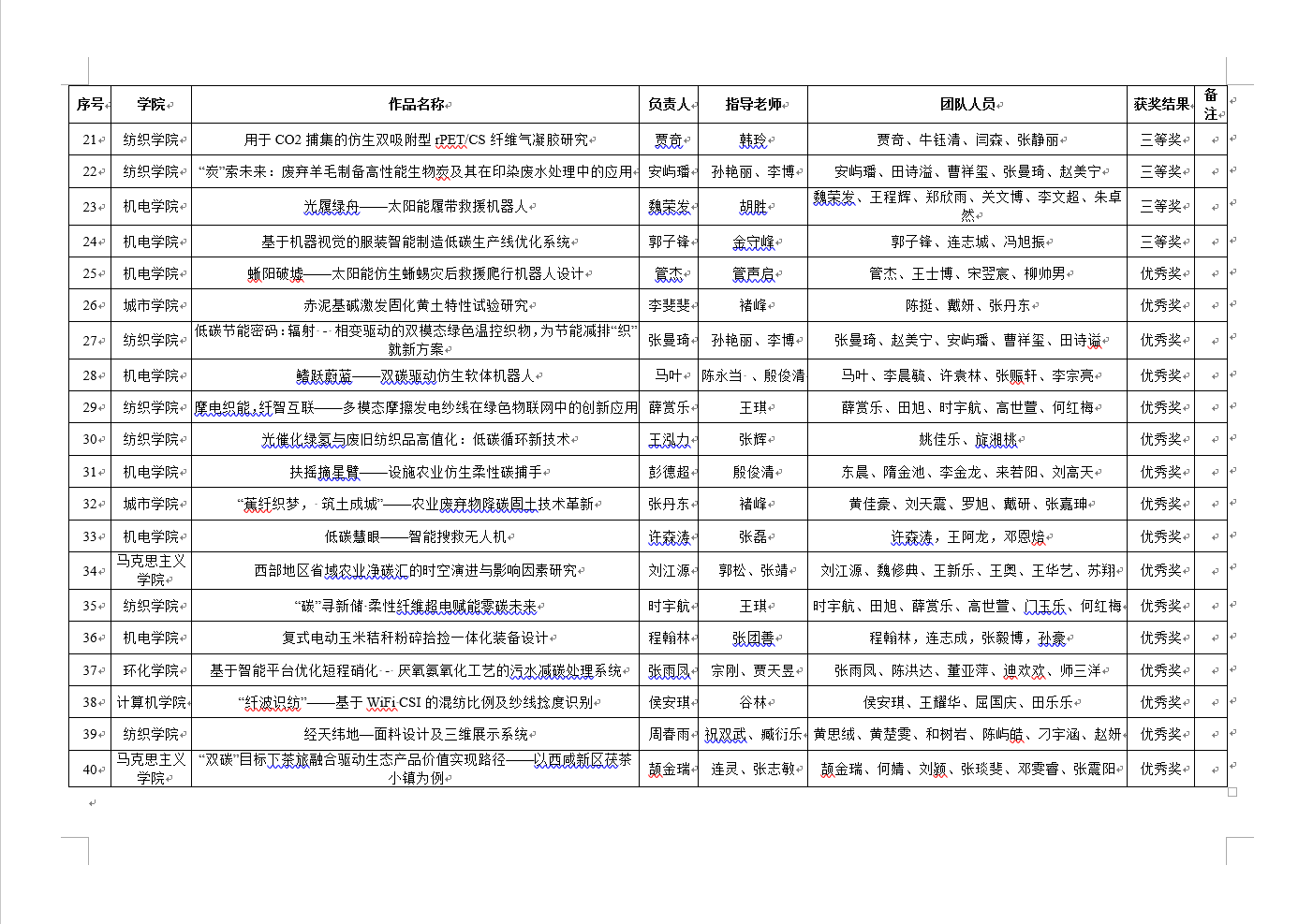 魏铭飞团队的《太阳能储存驱动昼夜连续光催化-污水低碳再生新技术探索》、机电学院李军团队的《智御天雷,守护绿能——基于双机协同的风电叶片接闪器智能维护系统》、纺织学院程静团队的《智感自适应性零碳“空调织物”》以及城市学院赵俊尧团队的《新型水下聚凝充填材料(NWC-FM)——盾构泥资源化的双碳解决方案》二等奖8项、三等奖12项,优秀奖16项。