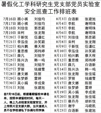 本次暑期巡查工作有效展现了新时代青年党员的责任担当,为营造安全、和谐、高效的科研环境贡献了青春力量。化工学科研究生党支部将继续扎实推进实验室安全巡查常态化,为学院科研工作高质量发展保驾护航。