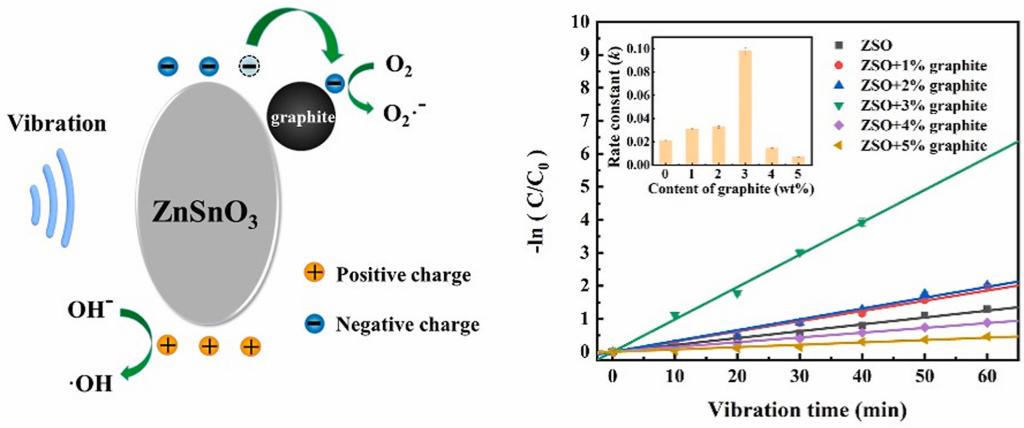 环化学院为第一单位。本工作中,通过溶胶凝胶法合成了压电锡酸锌纳米材料,并在其中混合一定比例的导电石墨,用于加速压电诱导的载流子的迁移,从而获得提高了的压催化性能。在混合石墨比例为3%时,压催化效果达到最优,对罗丹明B染料溶液的降解率达~100%,反应速率常数为~0.098 min-1,远高于纯锡酸锌催化剂对罗丹明B染料溶液的降解率~73%和反应速率常数~0.021 min-1。该压催化剂在纺织印染废水中处理中具有重要的应用前景。