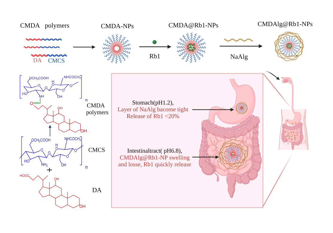 研究团队以羧甲基壳聚糖,脱氧胆酸及海藻酸钠为材料制备了pH响应型羧甲基壳聚糖-脱氧胆酸/海藻酸钠载人参皂苷Rb1(Rb1)纳米粒子(CMDA/Alg@Rb1-NPs)。研究结果表明,CMDAlg@Rb1-NPs粒径为341.99nm,载药量和包埋率分别为0.15 mg/mg和72.14%。体外释放结果显示CMDA/Alg@Rb1-NPs具有pH响应和缓释效果。此外,经CMDAlg@Rb1-NPs干预后的肺癌细胞A549的存活率降低(Rb1浓度为1.6mM时,细胞存活率降低约4倍)。CMDA/Alg@Rb1非常具有开发成口服抗肿瘤药物制剂的潜力。
