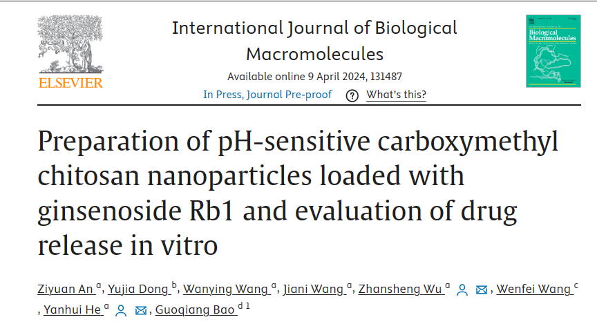 近日,环化学院武占省教授团队在载人参皂苷纳米粒子研究方向取得重要进展,于2024年4月在International Journal of Biological Macromolecules期刊(中国科学院一区Top,影响因子8.2)发表题目为:“Preparation of pH-sensitive carboxymethyl chitosan nanoparticles loaded with ginsenoside Rb1 and evaluation of drug release in vitro.”的研究论文。论文网址://doi.org/10.1016/j.ijbiomac.2024.131487。环化学院研究生安紫苑为第一作者指导教师何艳慧和武占省为通讯作者,海角网