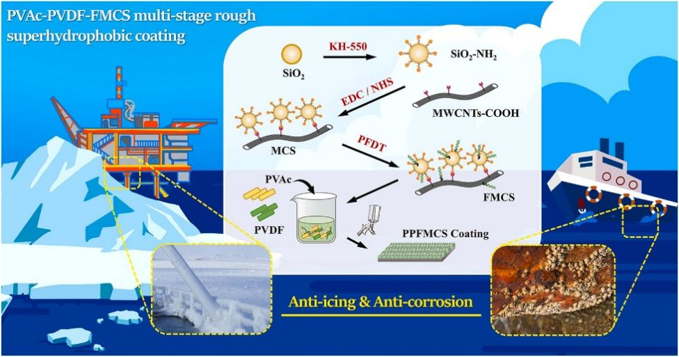 粗糙的超疏水表面有利于在水下捕获更多气体,从而增强船用设备的耐腐蚀性和防结冰性。在本研究中,采用冷喷涂法制备了多级粗糙超疏水涂层,显著提高了铝合金的防腐和防结冰性能。通过多壁碳纳米管和二氧化硅之间的交联设计了点线结构,促进典型多级粗糙表面的形成。所制备的涂层在金属基底上呈现出独特的超疏水性,水接触角高达为163.5°,该涂层在中国南海的海岸和深海中进行了防腐蚀性评价,结果表明涂层具有良好的防腐性能。此外,涂层在铝合金表面表现出较好的稳定性和减阻性能。这种基于点线结构设计的高性能超疏水涂层有望在海洋运输、石油勘探和极地勘探中得到实际应用。
