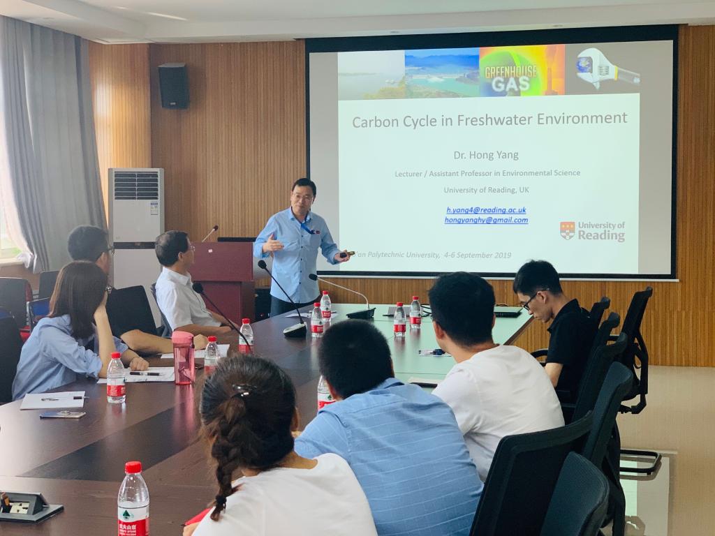 报告会上,杨洪博士做了题为“Carbon Cycle in Inland Waters”的学术报告,主要以瑞典、挪威、中国武汉等地湖泊、水库观测结果为例介绍了内陆水体二氧化碳、甲烷、氮氧化物等温室气体的收支动态,从宏观尺度阐述了全球温室气体收支中内陆水体的贡献,强调内陆水体温室气体收支的时空变化、影响因素及尺度问题,评价了现有工程地质方法用以封存、削减温室气体的效率。在随后的提问环节中,本学院师生和杨洪博士在气候变化成因与争议、湖泊温室气体排放与吸收机理、气体通量观测技术等多方面展开讨论,气氛热烈。