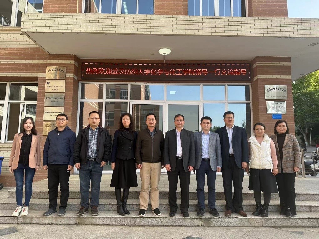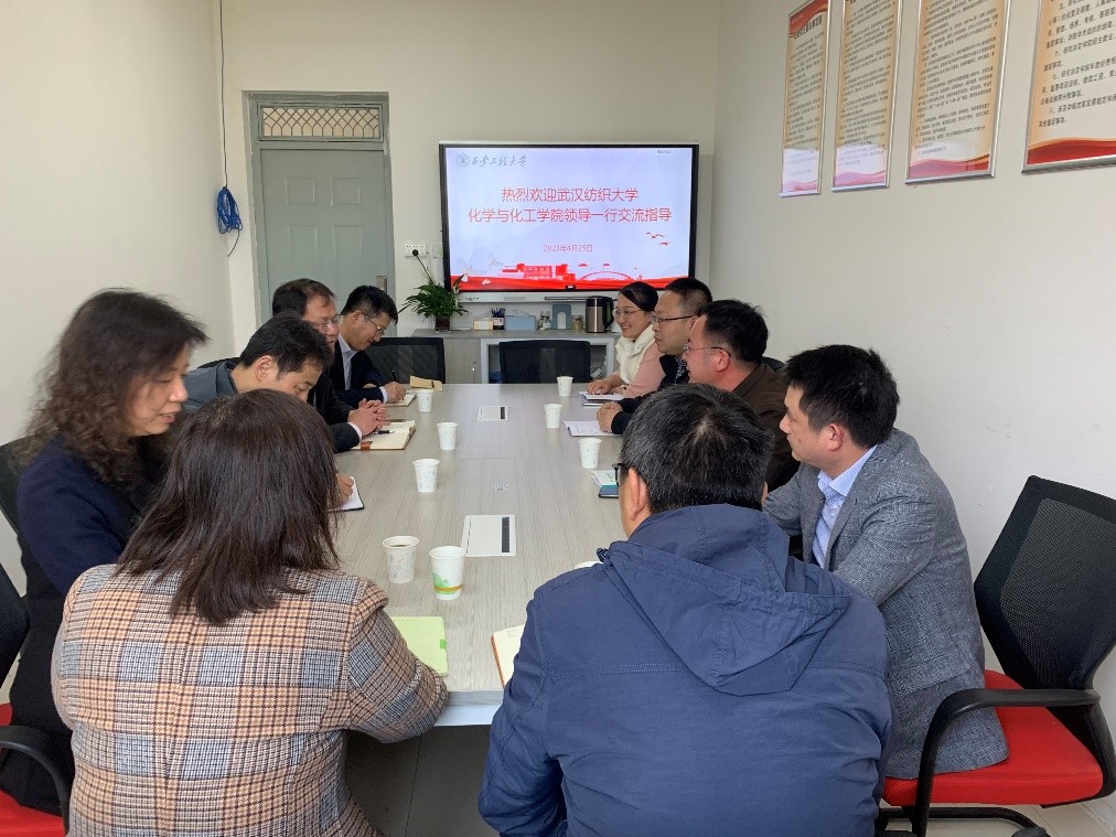 4月25日下午,武汉纺织大学化学与化工学院院长朱君江、副院长刘丽君、陈飞飞,化工系主任张然一行4人来海角网
