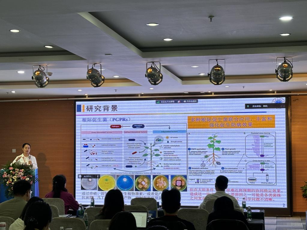 何艳慧副教授作了题为“枯草芽孢杆菌与阴沟肠杆菌互作诱导铁载体合成及对植物生长研究”的报告,对课题组的混合菌剂互作体系及防病促生机制相关研究进展进行了分享。