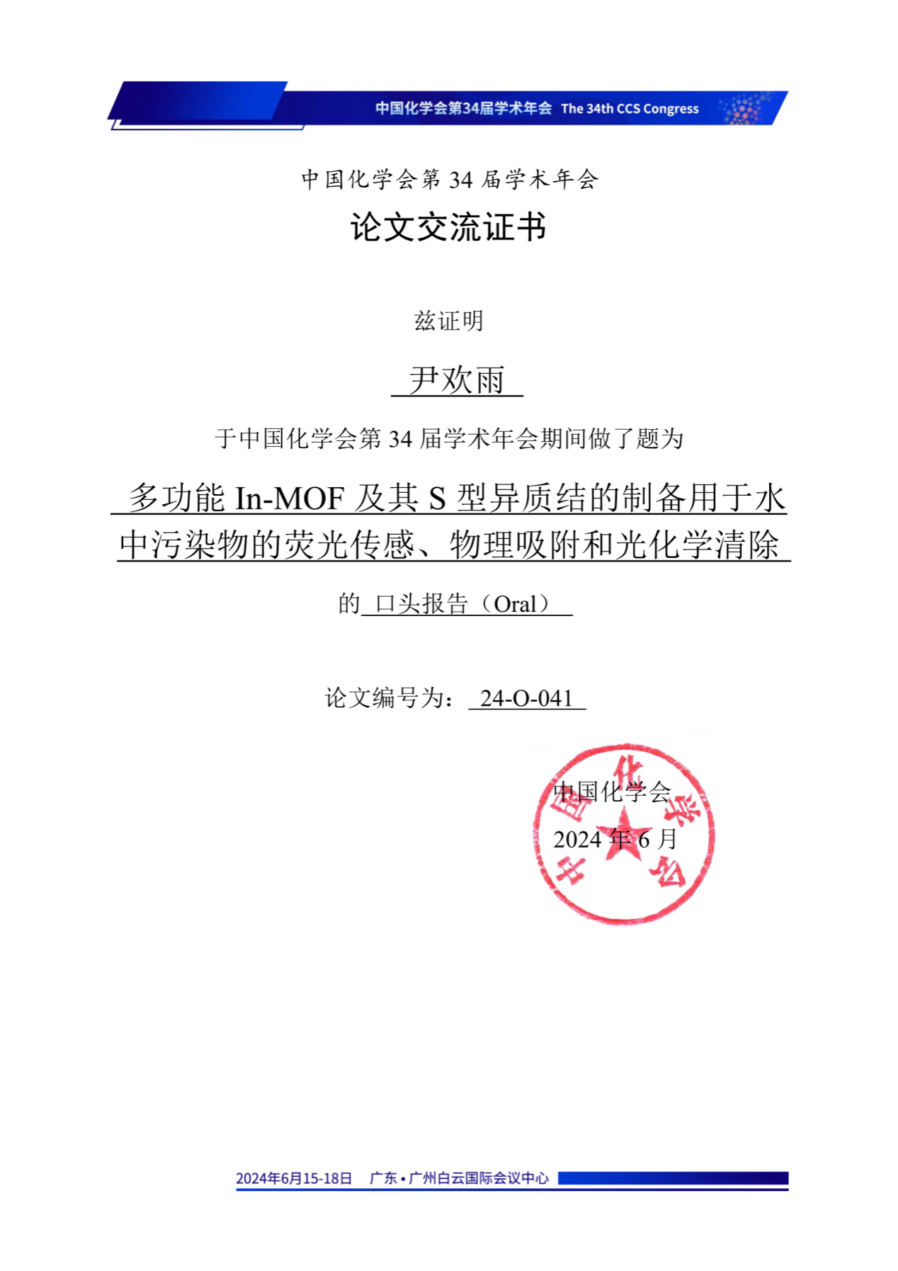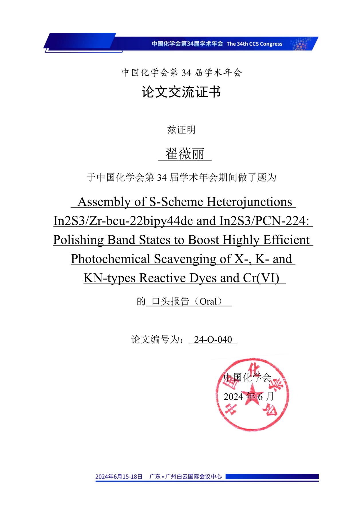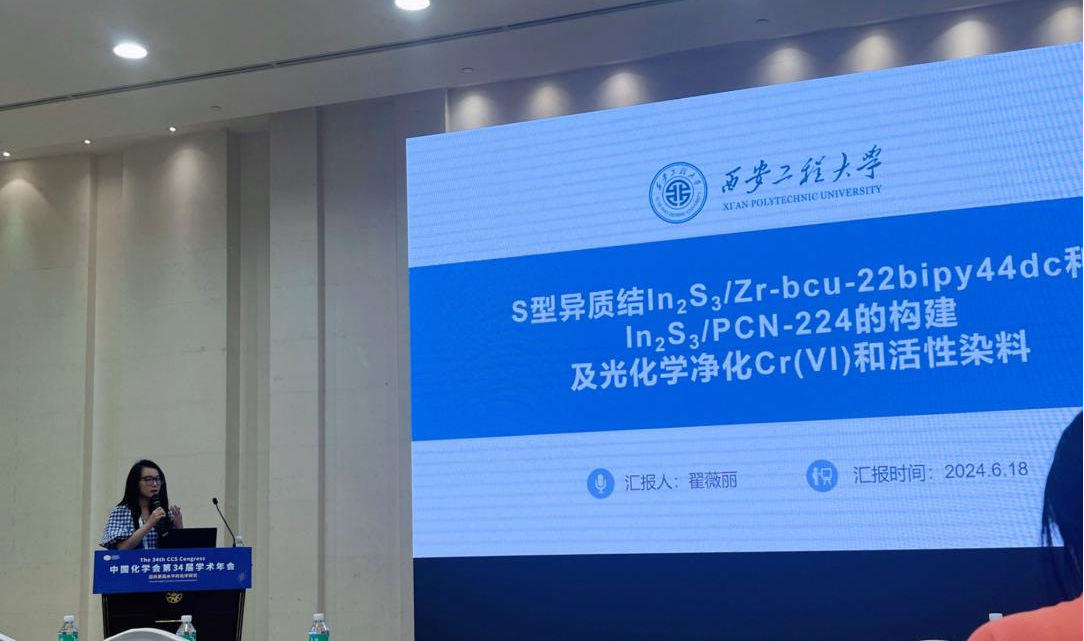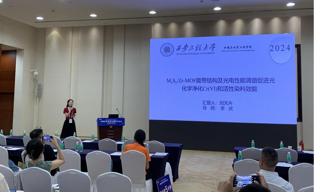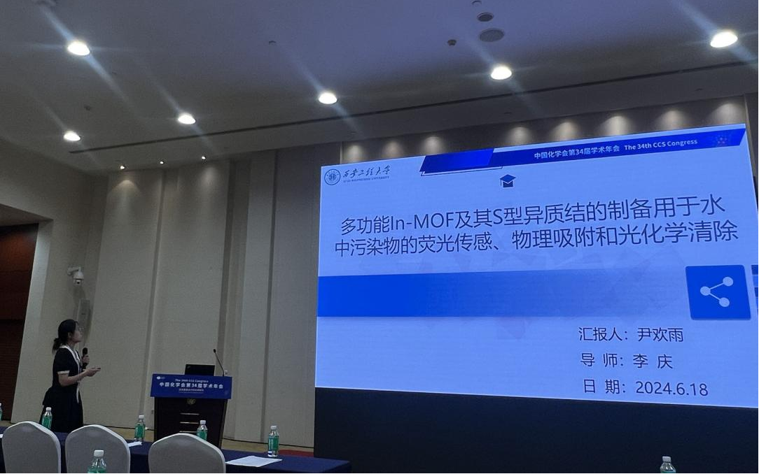 海角网 李庆老师指导的2023级博士研究生翟薇丽,2021级硕士研究生刘天卉尹欢雨参会,在第二十四分会(功能晶态材料)做口头学术报告,报告题目分别为:“Assembly of S-Scheme Heterojunctions In2S3/Zr-bcu-22bipy44dc and In2S3/PCN-224: Polishing Band States to Boost Highly Efficient Photochemical Scavenging of X-, K- and KN-types Reactive Dyes and Cr(VI)”(翟薇丽)、“Tuning Band Structures at Metal Sulfides/Zr-MOF Heterojunctions:Modulate Optical-electronic Properties to Boost Photocatalytic Detoxification of Cr(VI) and Degradation of Reactive Dyes”(刘天卉)及“多功能In-MOF及其S型异质结的制备用于水中污染物的荧光传感、物理吸附和光化学清除”(尹欢雨),分享了课题组在新型MOFs基水处理材料研发,以及对纺织印染废水中常见重金属离子的荧光传感检测、有机及无机污染物的光化学清除方面的研究进展,并同与会专家学者进行了交流和讨论,展示了我校化学工程与技术、纺织科学与工程学科在相关研究领域的学术研究水平。