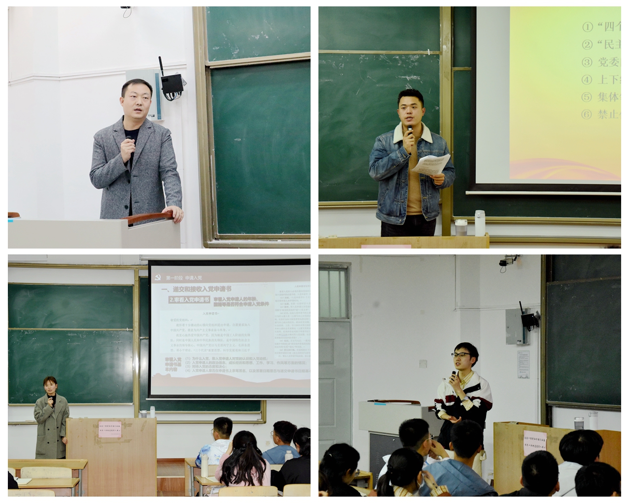 接下来,几位老师分别从“党的组织原则和组织纪律”、“党员的权利和义务”、“强化宗旨意识,积极发挥模范带头作用”等方面为同学们做了专题讲解,鼓励同学们加强理论学习,不断增强党性修养,提高自身素质,以共产党员的标准严格要求自己,积极发挥模范带头作用。全体入党积极分子观看了抗美援朝系列纪录片《为了和平》。