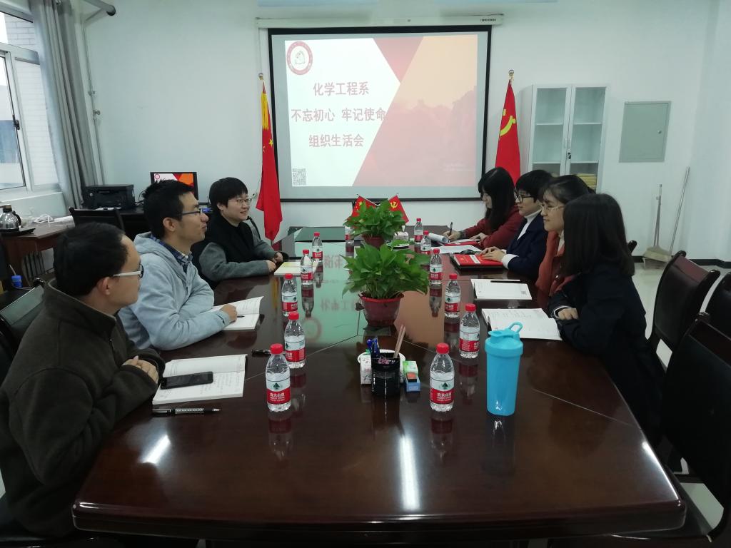 2019年10月24日上午,环化学院化工系党支部在环化学院506会议室召开了“不忘初心、牢记使命”主题生活会。支部书记杜燕萍同志根据党中央的要求,向青年教师党员们强调了立德树人的重要性,督促大家进一步学习习近平关于对高校教师的党建要求。并进一步深入讨论了“双创”支部的建设要求,对照职责进行了详细分工,党员们表示会以饱满的热情积极参与“双创”支部的建设。