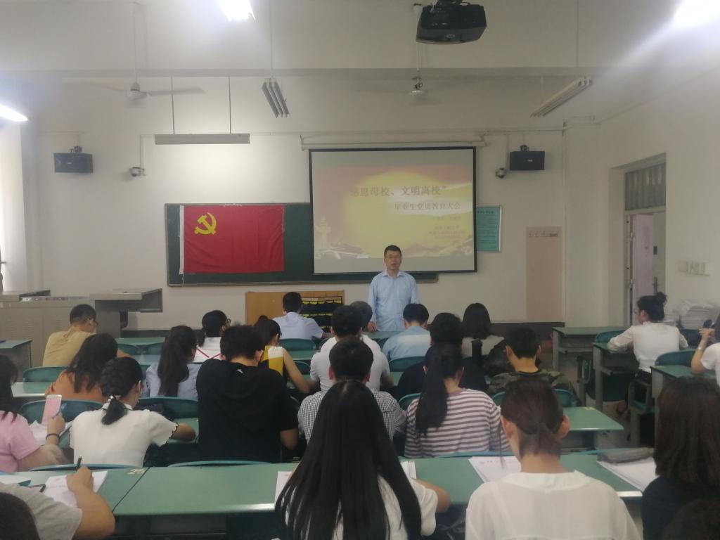 在临潼校区C-242教室举办以“感恩母校,文明离校”为主题的2018届毕业生党员教育大会。学院党委书记李建学、学生工作办公室主任林定武及学生2014级毕业生党支部的41名学生党员参加了活动。