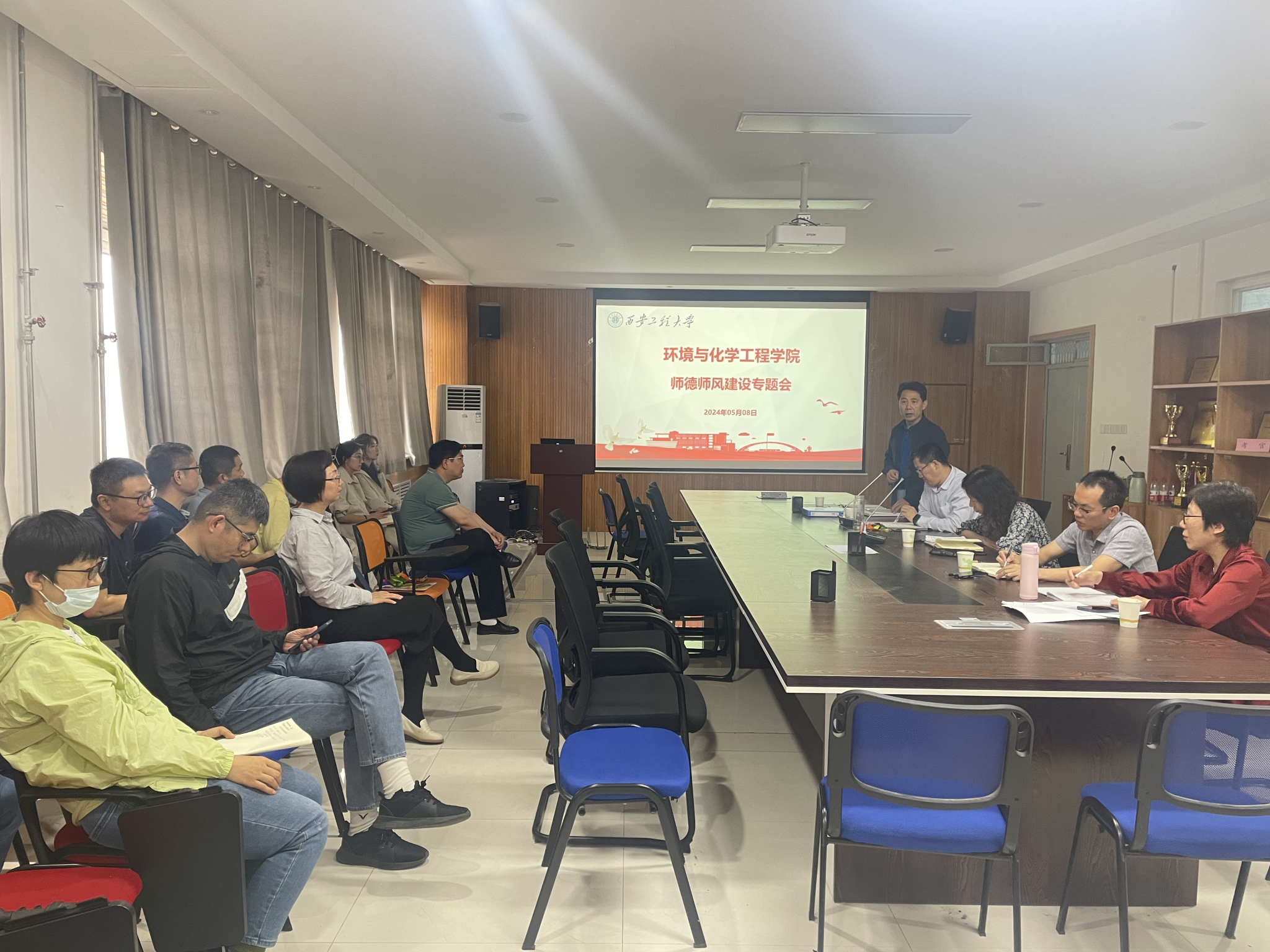 教育教学审核评估的各项准备工作,加强全院教师树牢立德树人思想的建设工作。5月8日下午,学院在507会议室召开师德师风工作会。会议由学院党委书记胡西民主持,全院教师参会。