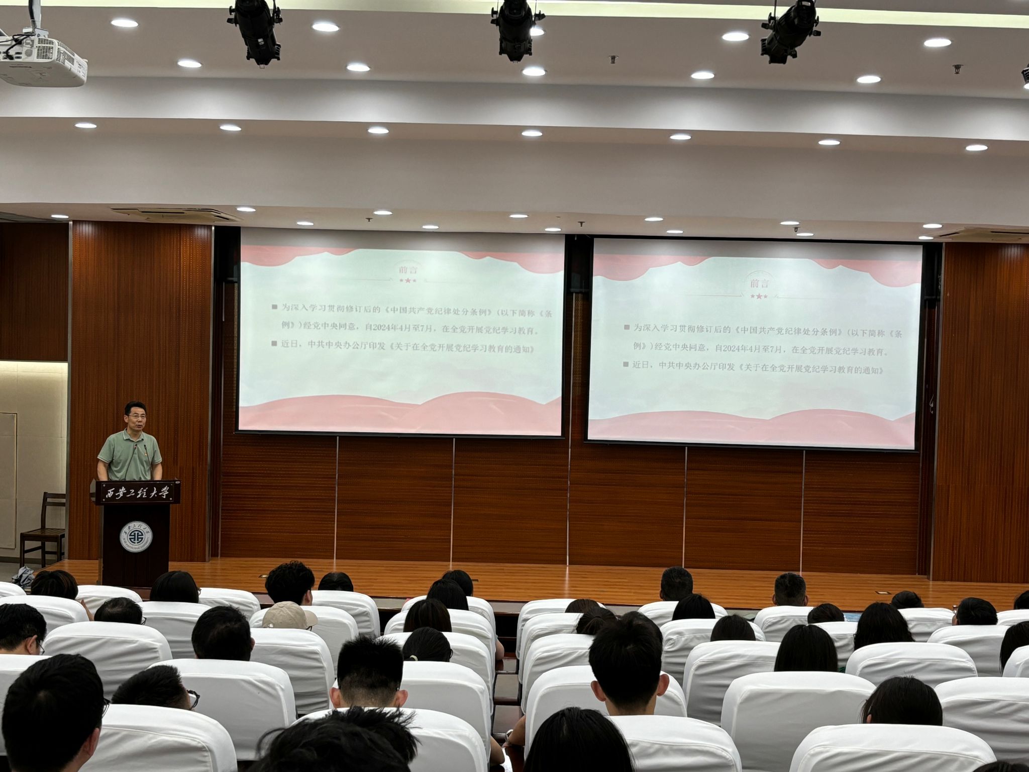 于图书馆二楼报告厅举办党纪学习教育专题党课。学院党委书记胡西民以“扎实开展党纪学习教育,以严的基调全面加强纪律建设”为主题为全体师生党员进行现场授课。