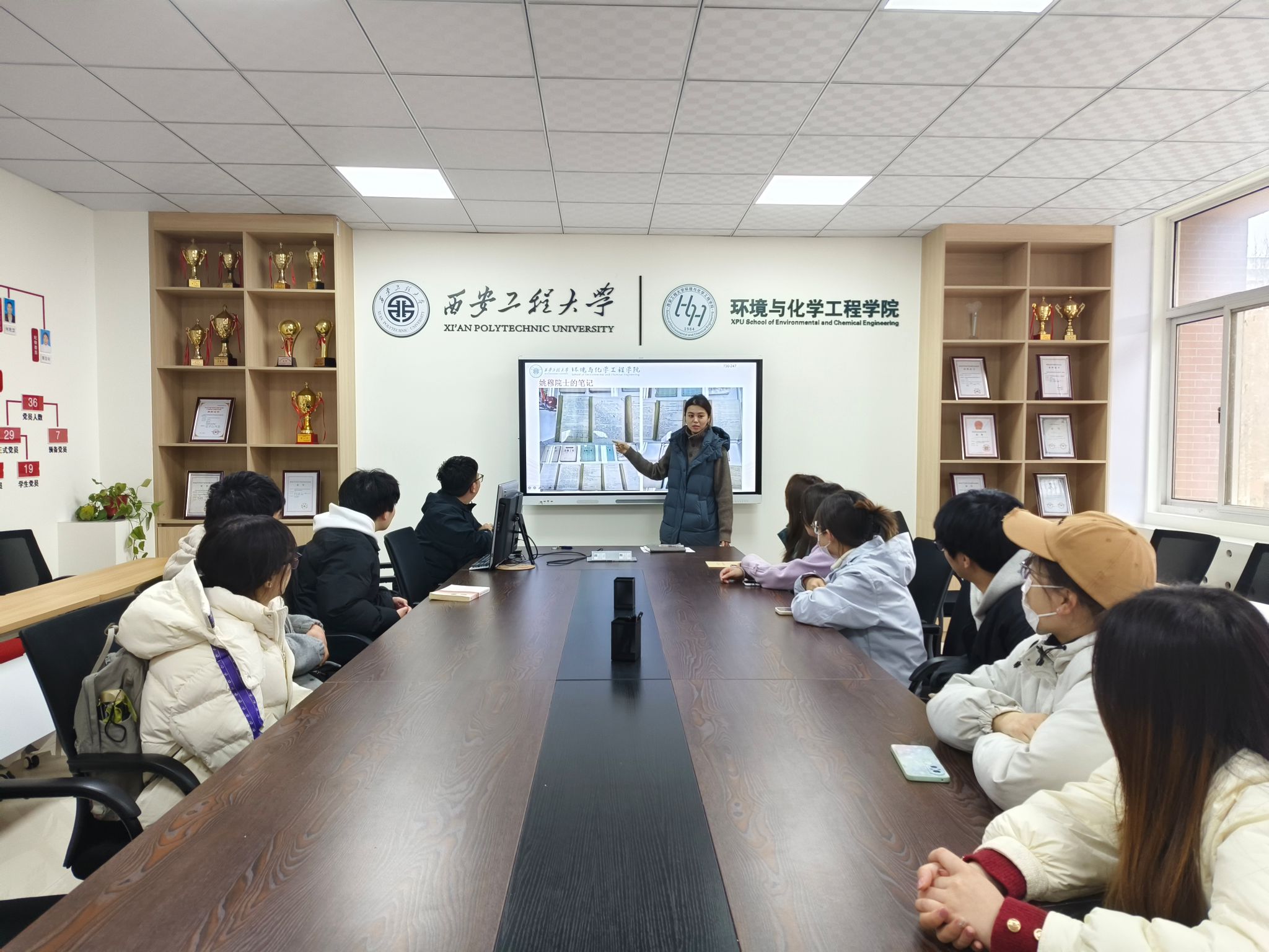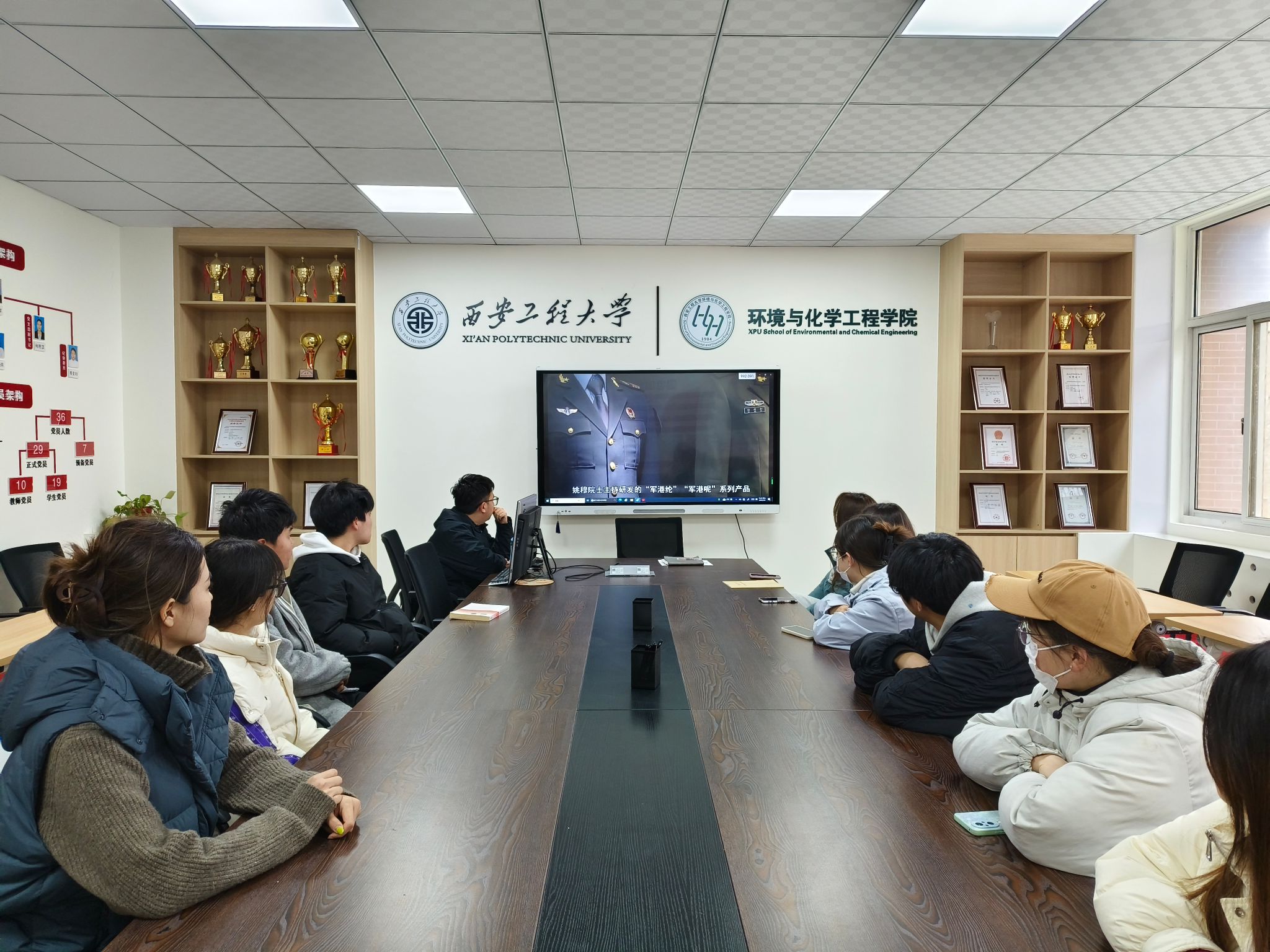 活动伊始,全体成员集中观看“陕”耀光芒在陕院士专题片第二季之《初心不改纺织报国——中国工程院院士姚穆》。影片通过珍贵史料展现了姚穆院士扎根西部六十余载的奋斗足迹:从突破军服面料技术瓶颈到攻克航天员服饰舒适性难题,他以科研成果回应国家需求;耄耋之年仍坚守科研一线,为国家培养千余名专业人才。他用行动诠释“科研报国育人不倦”的赤子情怀。