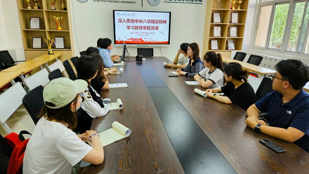化学工程与工艺专业学生党支部在环化楼236会议室召开“严守中央八项规定精神,争做新时代合格党员”专题党课,支部书记盖潇宇主讲,支部全体党员参与。