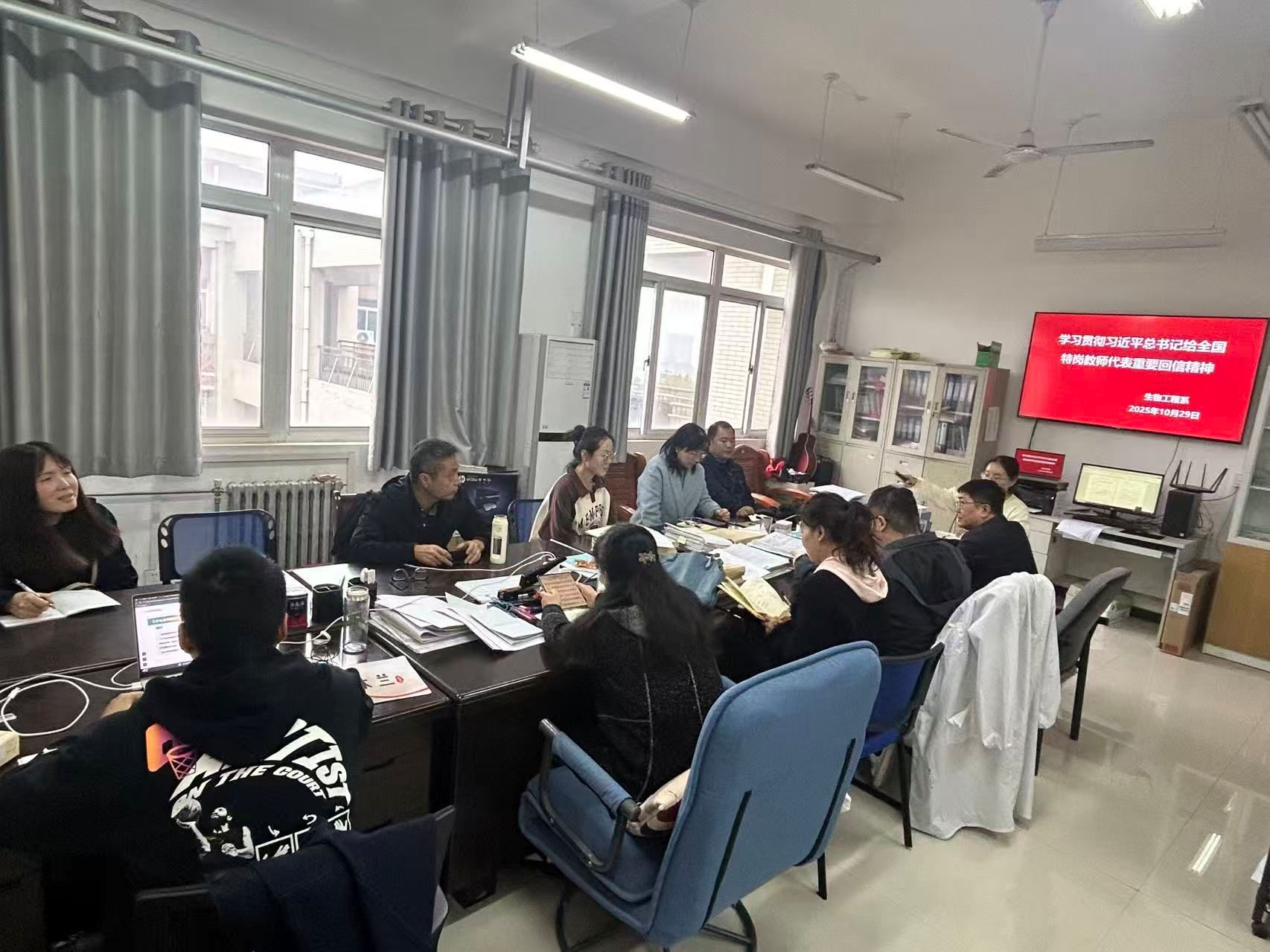 生物系党支部在生物工程专业教研室召开专题学习会,组织全体党员深入学习党的二十届四中全会精神与习近平总书记给全国特岗教师代表的重要回信精神。支部全体党员、部分教师代表以及学生党员骨干参加了学习,会议由党支部书记潘虹主持。