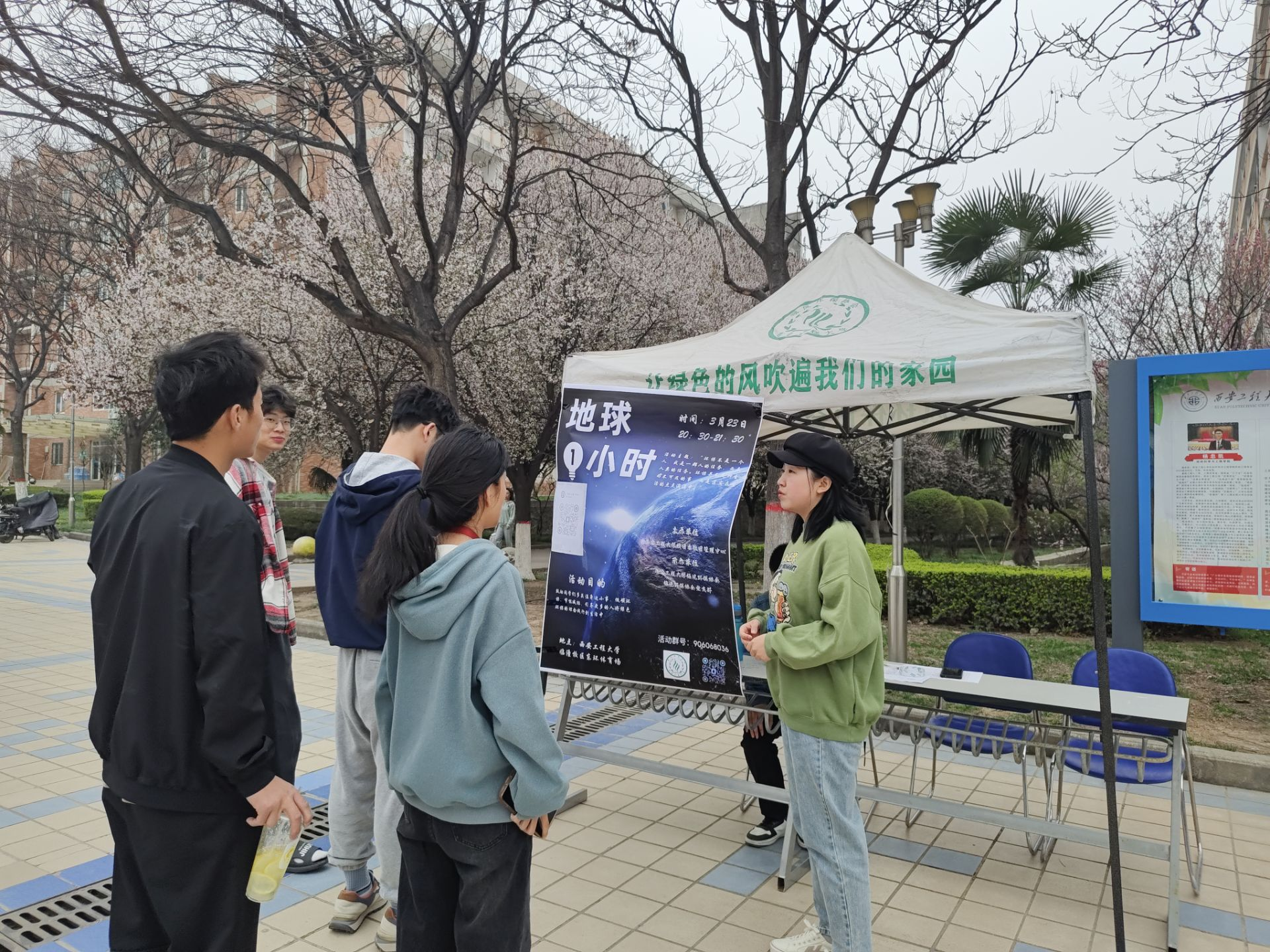 活动当天,绿风环保协会在临潼校区中心广场和学生宿舍向大家介绍“地球一小时”活动,倡导同学们养成节能习惯,增强对保护地球的责任感,呼吁大家在晚上8:30-9:3积极参与到“熄灯一小时”的活动中来。为配合活动的顺利开展,增强趣味性,他们还承办了“以旧换新、绿色集市”、“荧光夜跑”等活动,积极引导同学们走下宿舍、走向操场,以积极健康的心态来创造自己美好的校园生活。