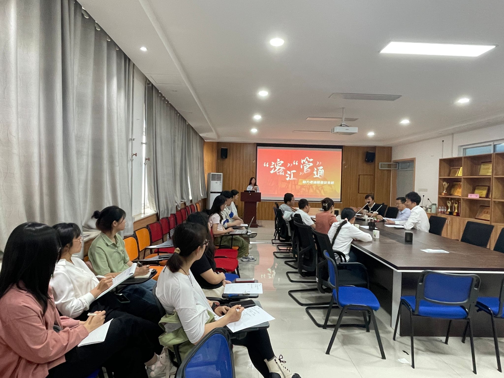 于507会议室举办了第十二届“挑战杯”赛前培训会。此次培训特邀人文社会科学学院院长张克英、学院主持工作副院长武占省、校团委创新实践部副部长黄冠对《“溶”“汇”“管”通—助力老油田重获生机》等4个项目团队开展“一对一”辅导。