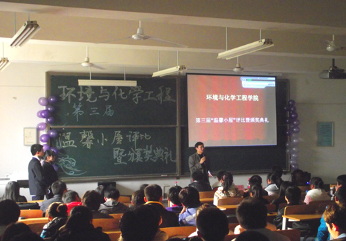 11月18日下午4时,环化学院第三届“温馨小屋”暨颁奖典礼在临潼校区教学楼D-3110举行。下午3时50分,学生工作办公室副主任、团总支书记王晓先老师以及学生会常委作为评委在11级同学的掌声中入场就坐。