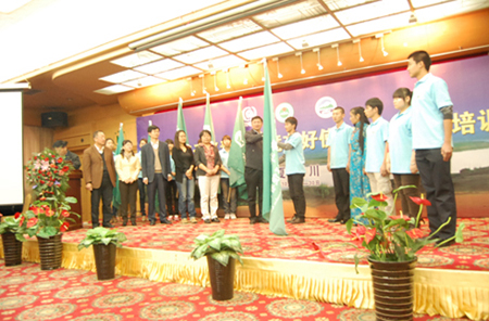 国家环保部以及宁夏环保厅有关领导、专家、项目办人员以及首批青年环境友好使者百家绿色先锋代表出席了开幕式。我校学生李悦猛作为陕西青年使者代表庄严地从宁夏环保厅领导的接过授旗,为环保许下最真的承诺。之后,各位专家老师们做了为期一天半的主题培训。其主要内容为:神奇的地球、文明的反思、绿色的变革、如何进行项目管理、经验分享等。通过专家讲座、播放录像、案例分析、新老使者交流以及互动游戏等方式,讲解热点环境问题、环境知识,树立环境意识,提高开展再培训以及开展环保活动的技能。