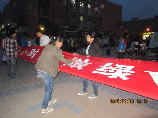 3月23日下午,由”绿风”环保协会承办的“地球一小时,我做绿V客”活动在临潼校区中心广场开展。此活动是为了响应WWF(世界自然基金会)发动的全球最大的应对气候变化的公益行动——“地球一小时”。活动倡议在当天晚上8:30至9:30熄灯一小时,以唤起广大师生节约资源,保护环境的意识。
