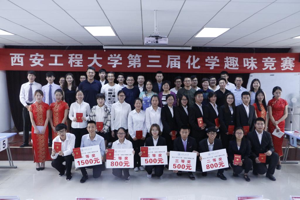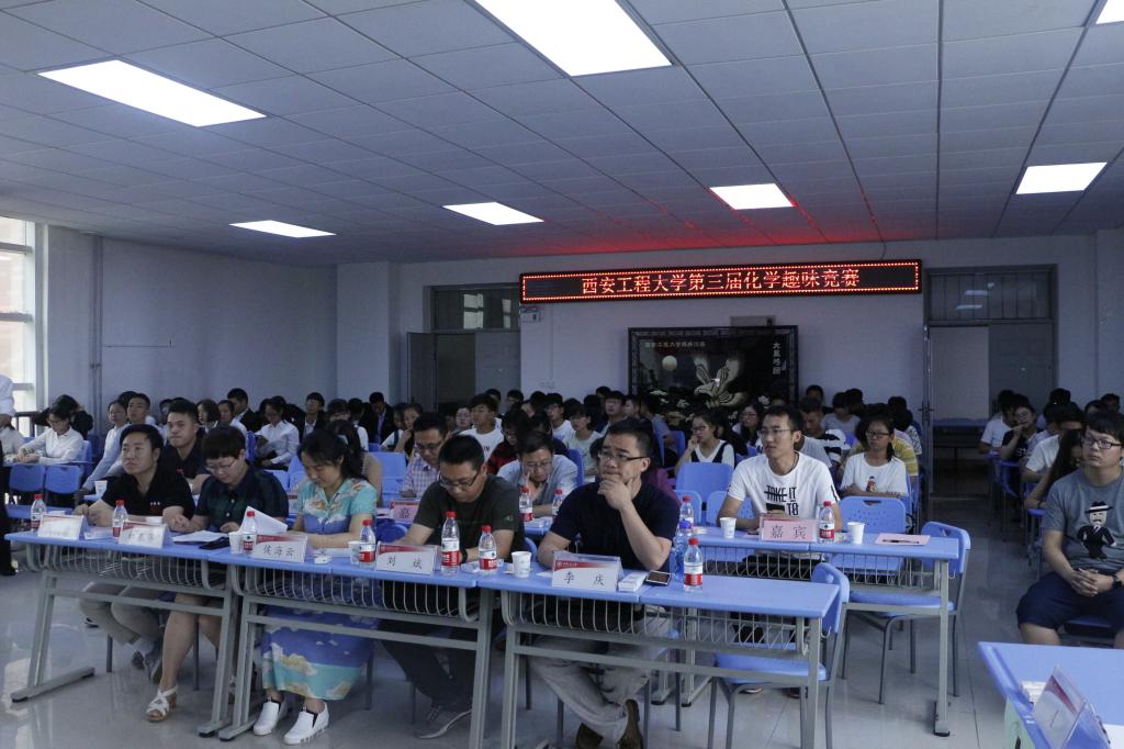 第三届化学趣味竞赛在我校临潼校区人文楼214举行。校团委书记王晓先、纺织与材料学院学工办主任赵勇进、环化学院党委副书记袁群等老师参加了比赛。评委老师由环化学院侯海云教授、刘斌副教授、杜燕萍、李庆、朱炜老师担任。纺织学院、机电学院、电信学院、环化学院、理学院的五支代表队参与了本次比赛。
