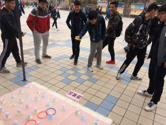 上午十点,全体社团成员积极地筹备活动前期的准备工作。活动的基本流程:领套圈,进行套圈游戏,答题,领小奖品。十一点多,已经有同学跃跃欲试,急切的想参与活动。放学后,同学们蜂拥而至,参与活动的同学络绎不绝,一次次套圈套上烧杯又掉下来的惊心动魄,一声声的尖叫声,活动在一片愉悦的气氛中推向高潮。随着时间的推移,活动接近尾声,社团指导老师朱炜老师也来为社团活动作出高度赞扬与评价。