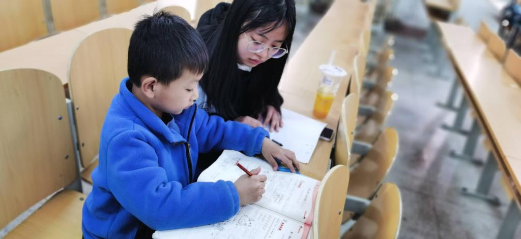 志愿们分批次在每周日按时到达指定地点,带领食堂员工子女前往A栋教学楼进行两个小时的作业辅导,用自己学到的知识和技能帮助小朋友。在补习过程中,志愿者们身心投入,耐心解答,以生动有趣的方式搭起“大孩子”与“小孩子”之间的沟通桥梁。在聊天的过程中提及家庭,有位小朋友便写下孟郊的《游子吟》:“慈母手中线,游子身上衣……”让在场人员感慨万千。学习之余,志愿者们带着孩子们画画、游玩,教孩子做手工艺术品,劳逸结合,“你画我猜”更是激起同学们此起彼伏的欢笑,也将雷锋精神的种子埋进了众多小朋友心间。结束后,全体人员拍照留念,志愿者将孩子安全送回食堂。