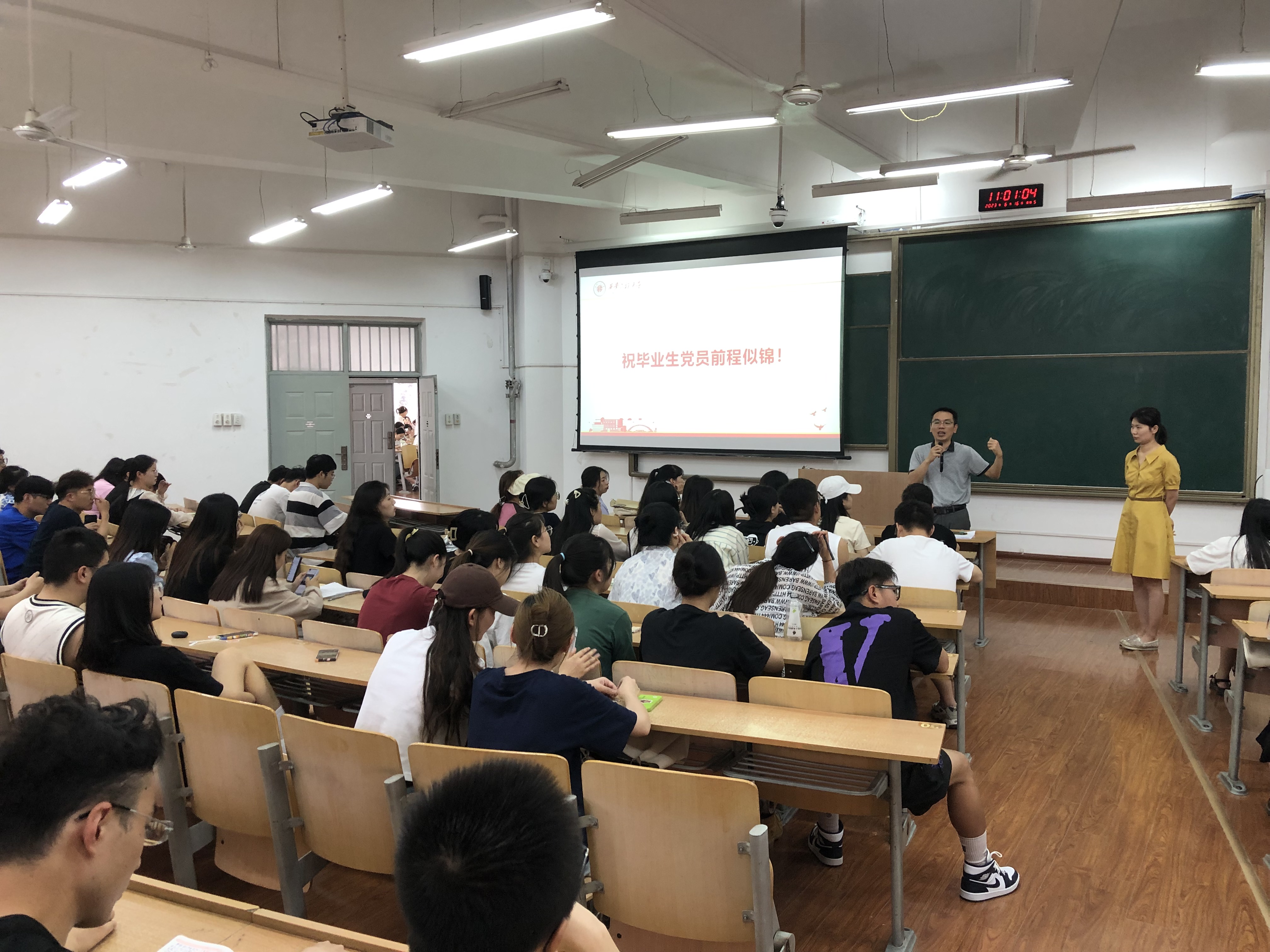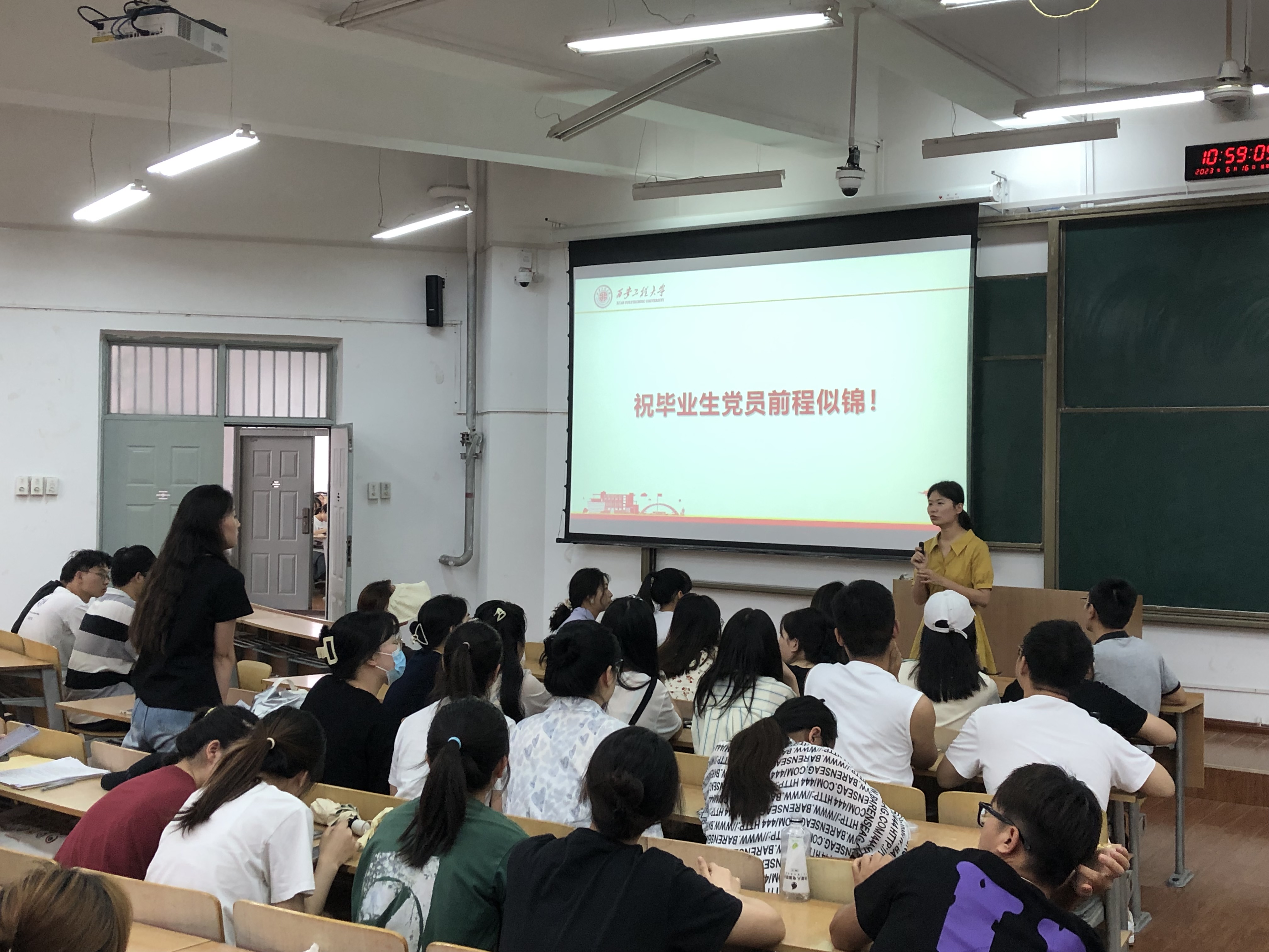 会上,辅导员刘婧从党员档案审查、落实组织关系去向、开据组织关系介绍信、核查毕业生组织关系落实情况四个方面详细介绍了党组织关系转接的系列程序及注意事项,并多次强调党组织关系转接的及时性与重要性。在接收单位方面,根据是否落实工作单位两种介绍了不同的接收方式;针对转入省内和省外不同情况,做了具体的注意事项和转接方式的说明。此外,她对毕业生党员提出殷切希望,嘱咐毕业生党员进入社会踏上工作岗位后,要将理想信念具象化,融入到实实在在的工作中,充分发挥党员的先锋模范作用。