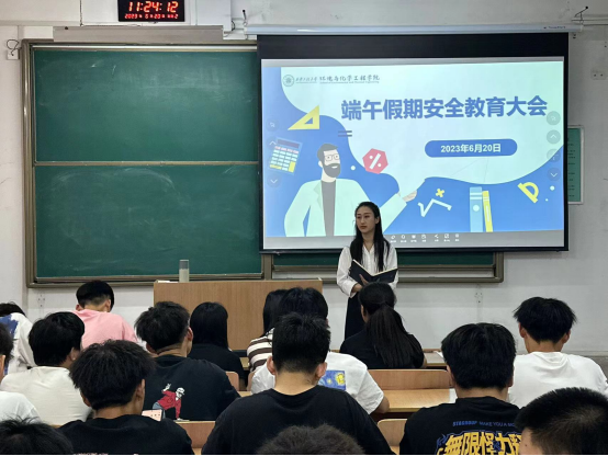 在临潼校区A132教室召开端午节假期安全教育主题会议,2022级辅导员任子瑜和全体团支书、班长参加本次会议。