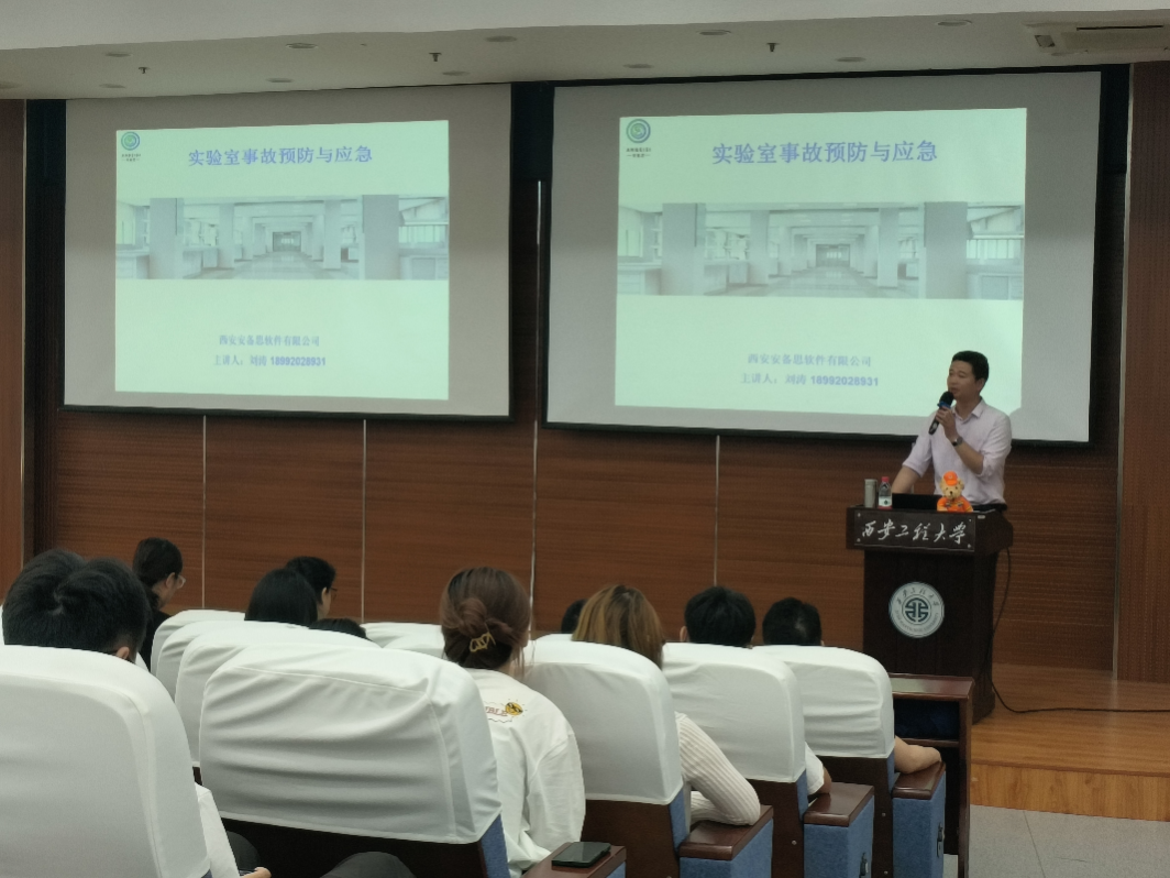 本次邀请西安安备思软件有限公司刘涛总经理做的题为“实验室事故预防与应急”的讲座,他从高校实验室安全事故知识、事故的危害、事故预防与应急处置等方面为同学们做了详细的讲解,要求同学们在实验前要对环境、设备和相关材料进行细致的检查,规范实验操作,要严格按照实验室管理规定,加强水、电、气、危化品的管理,切实保障实验室有序运行。