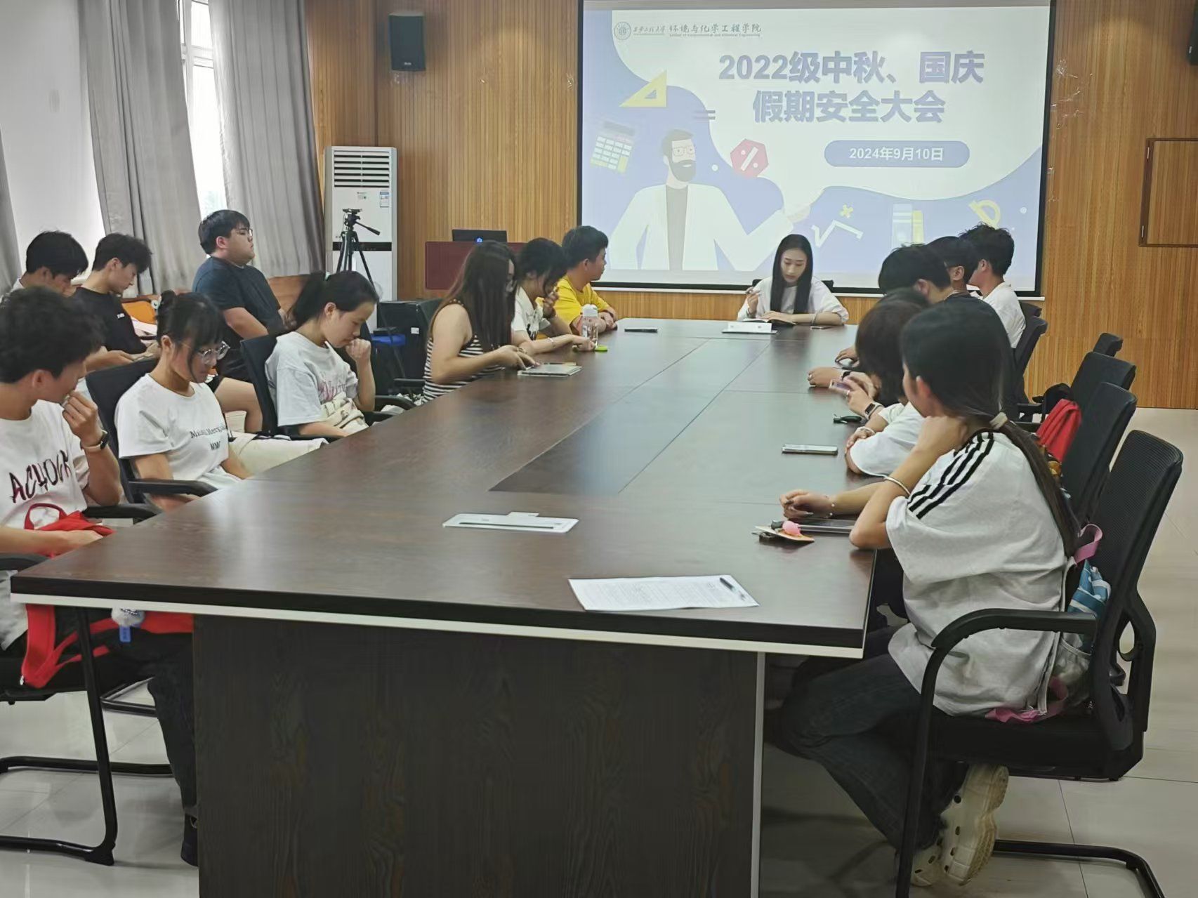 在学院507会议室召开2022级本科生中秋节假期安全教育大会,2022级班长、团支书及部分班级代表参会,会议由辅导员任子瑜主持。