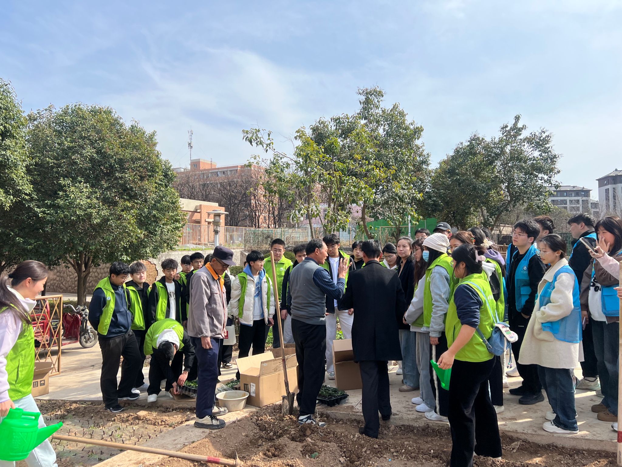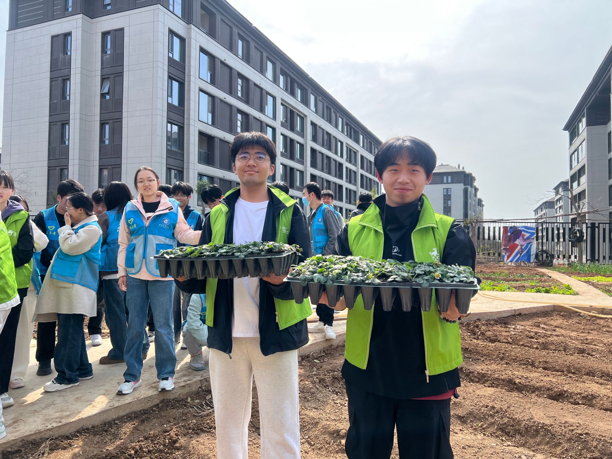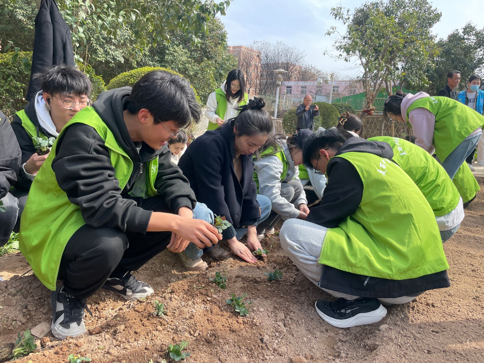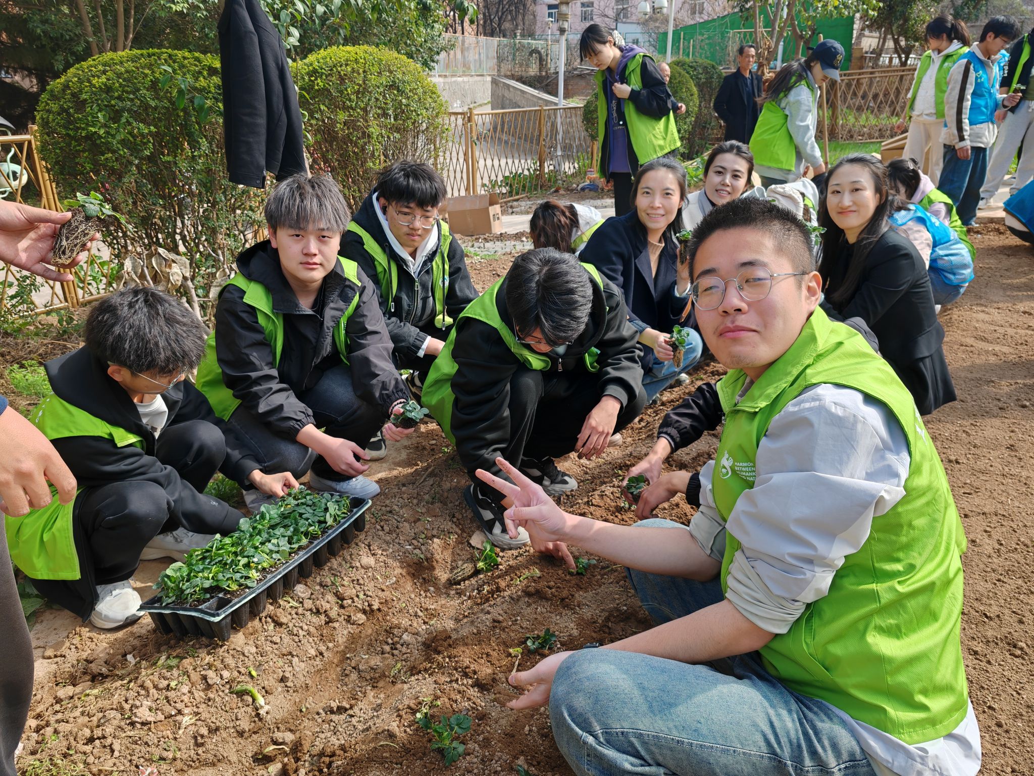 在临潼校区“耕读小园”大学生劳动实践教育基地开展了“春日播绿”草莓种植劳动实践活动,活动组织30余名受助学生参与。