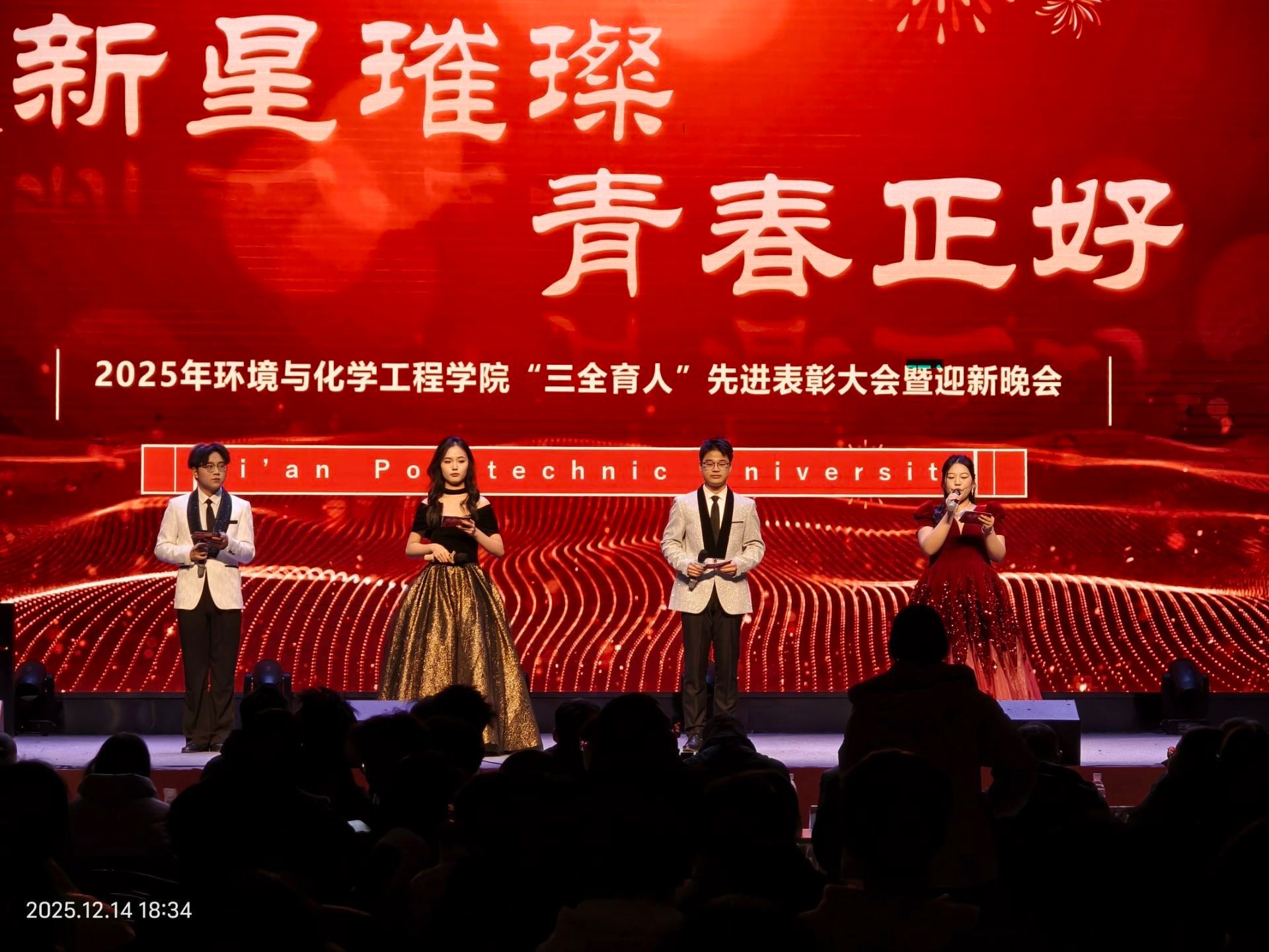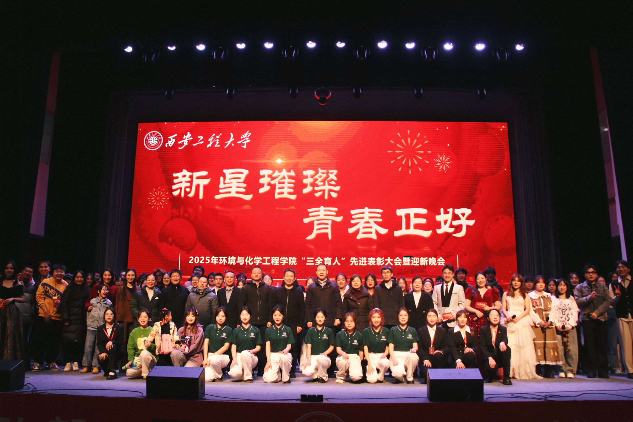 表彰环节结束后,迎新文艺汇演热烈开场。环境工程2401班学子以舞蹈《锅庄起舞》率先亮相,节奏明快、舞姿奔放,点燃全场青春热情;研究生学子带来的歌曲串烧《飘向北方+最美的太阳》,以深情演唱诠释追梦初心,引发现场共鸣;先进班集体代表朗诵《青春远征》,语调铿锵、情感真挚,抒发了深沉的家国情怀;2025级辅导员吕国正与新生代表共同表演唱跳节目《我的未来式》,师生默契互动、旋律欢快动人,将晚会推向高潮。最后,全体师生齐声高唱《我和我的祖国》,歌声激昂,晚会在一片庄严而热烈的氛围中圆满落幕。会后,嘉宾与演职人员合影留念,新老学子携手并肩,定格下环化人团结奋进的珍贵画面。