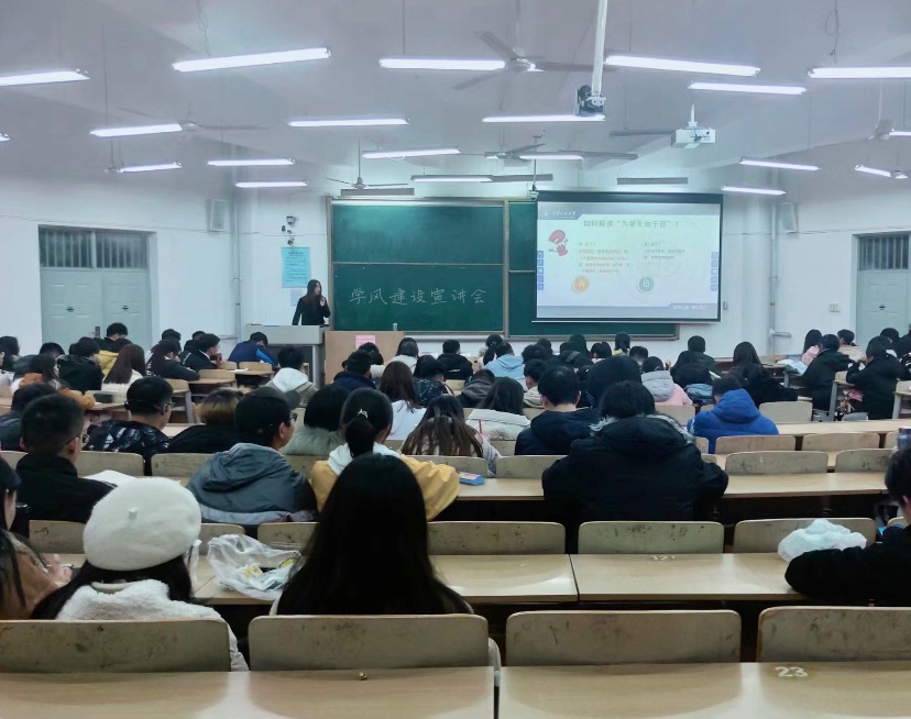 于12月19号在B座教学楼133教室召开学风建设宣讲会及考风考纪动员。会议由2019级辅导员刘梦雅主持。