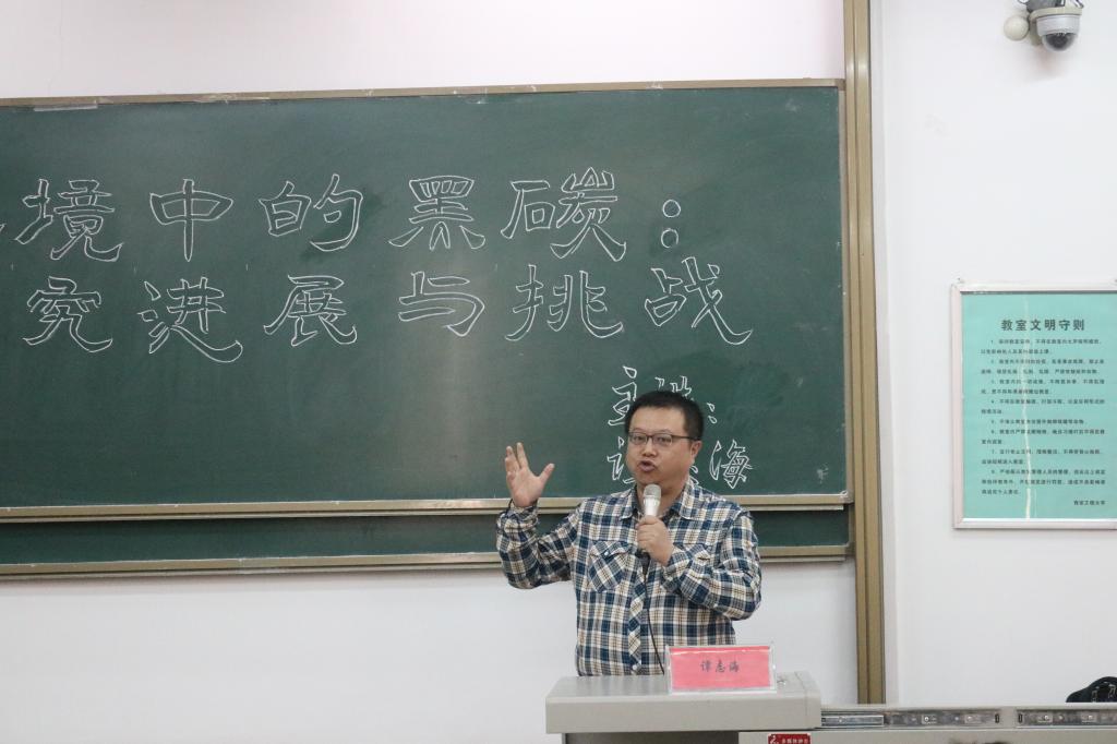 谭志海副教授在B-233教室举办了《环境中的黑碳:研究进展与挑战》为主题的学术报告。参加本次讲座的有:环化学院党委副书记袁群,环化学院学工办主任林定武,14、15、16级环科、环工专业学生。