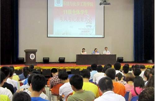 在临潼校区大学生活动中心举办了“2011级全体学生考风考纪教育”大会。学院党总支副书记袁群、学工办副主任林定武及11级全体学生共530余人参加了大会,会议由11级辅导员代亚娟主持。