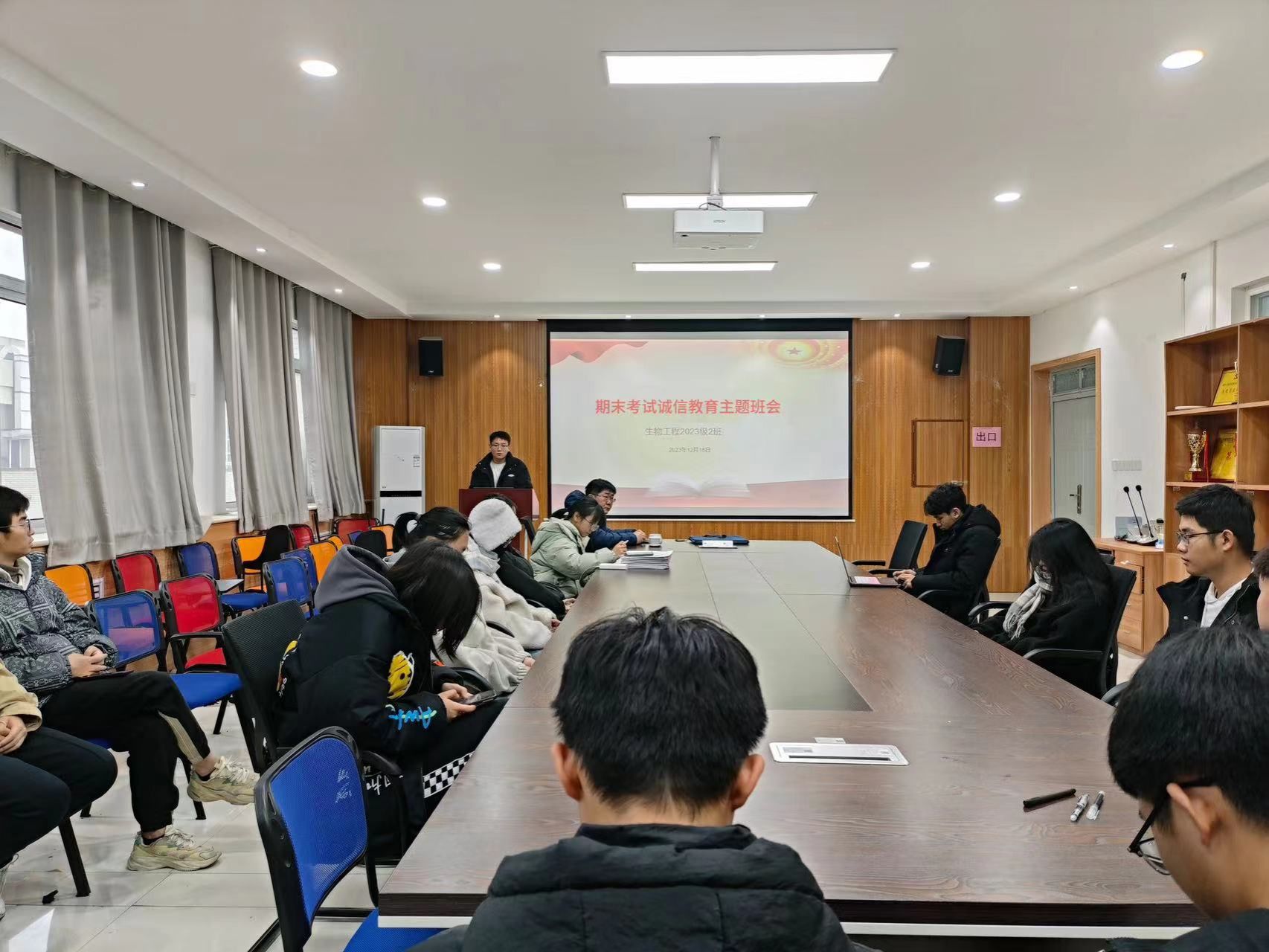 随着期末考试的临近,为严肃考风考纪、加强学风建设,营造文明诚信考试的良好氛围,各班于12月18日开展期末考试诚信教育主题班会,会议由各班班长和团支书主持,辅导员及全体学生参会。