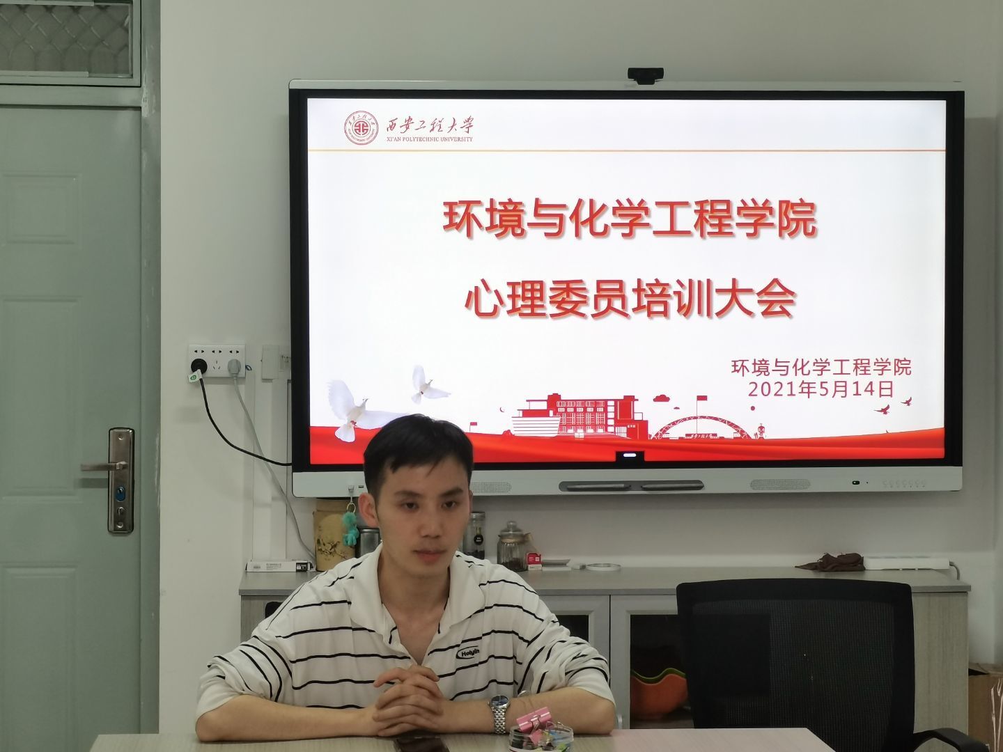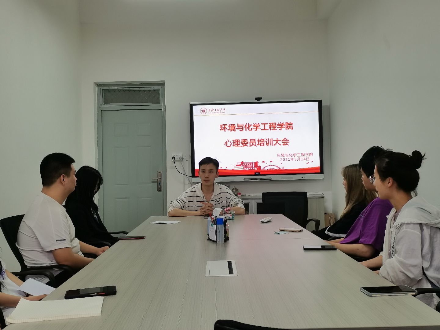 于环化楼238会议室召开心理委员培训大会。参加本次会议的有20级辅导员张易泽以及20级各班心理委员。