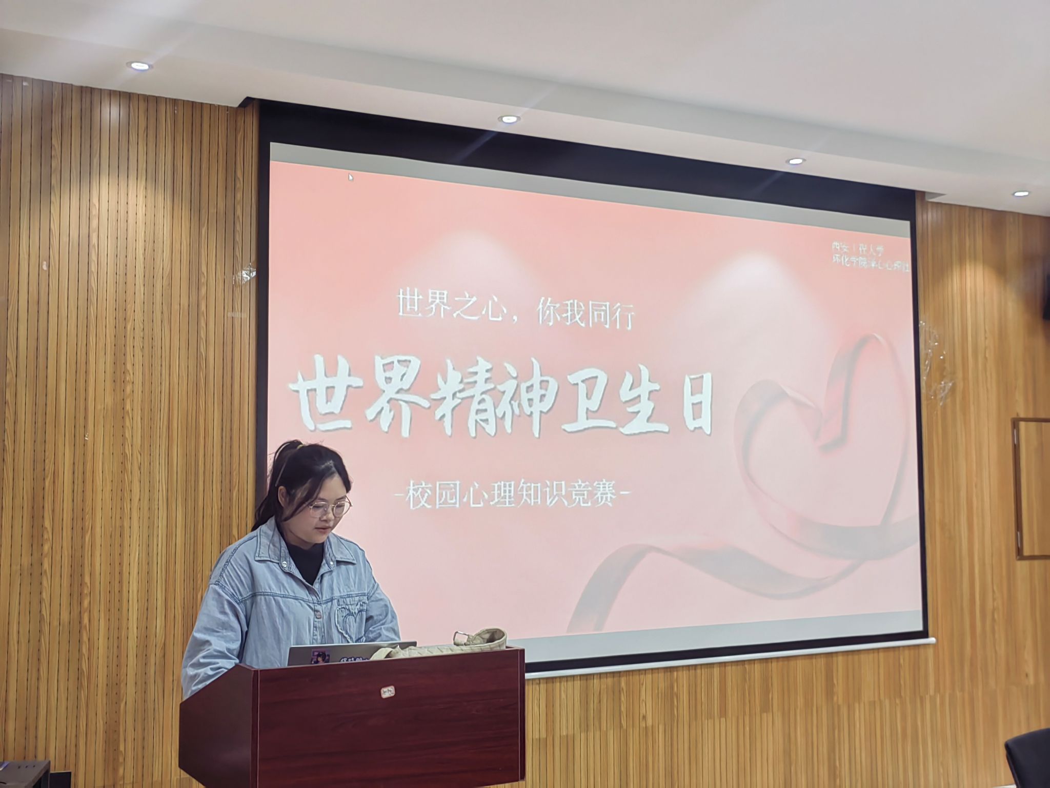 全体学生进行知识竞赛。社长高乐洋及译心心理社社员参与主持活动。
