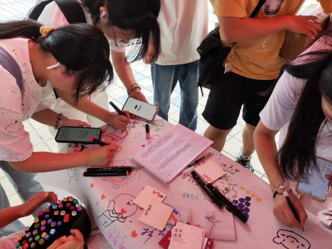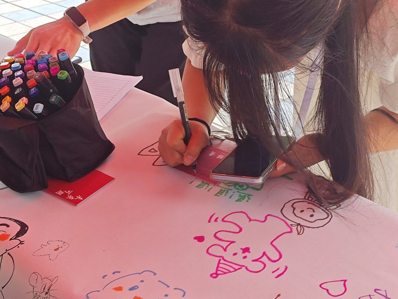 此次活动旨在通过绘画这一艺术形式,引导学生积极面对内心情感,促进心理健康发展。活动现场,学生们组成了一支支充满活力和创意的绘画团队。每个团队都围绕心理健康主题,展开了一场别开生面的接力绘画比赛。在比赛中,学生们以饱满的热情和无限的创意,在画布上描绘出了一幅幅寓意深刻、富有感染力的作品。这些作品内容丰富、形式多样,既有对美好生活的向往,也有对内心世界的探索,不仅表达了对心理健康的关注和认识,还展现了同学们积极向上的精神风貌和团队协作的能力。