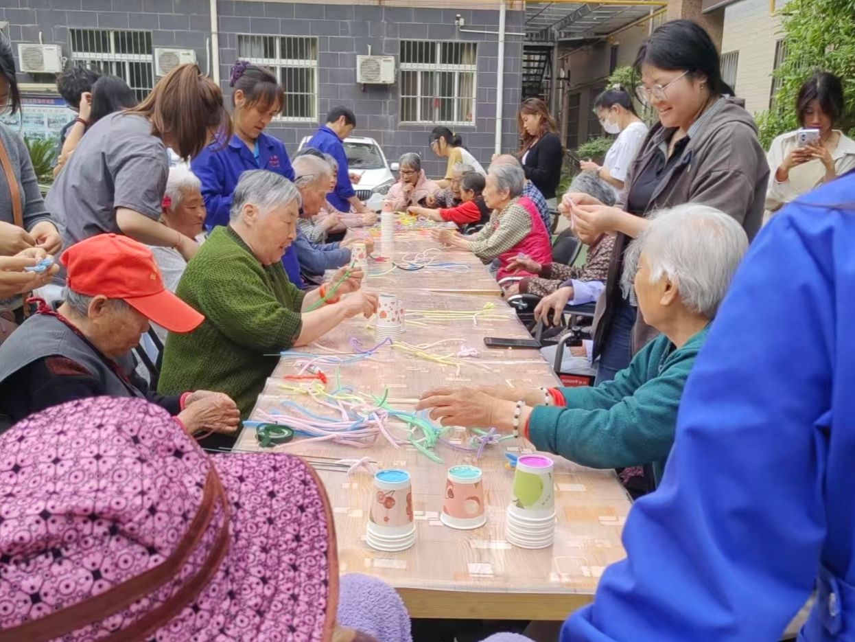 活动中,志愿者们化身“银发天使”,先细致打扫起居环境,后精心组织纸杯叠叠乐竞赛和扭扭棒手工课堂。八十岁的李奶奶捧着自制的扭扭棒向日葵笑着说:“这些孩子教得比亲孙女还有耐心!”活动现场欢声不断,老人们在志愿者一对一陪伴下完成的手工作品,都化作了最珍贵的“夕阳纪念品”。