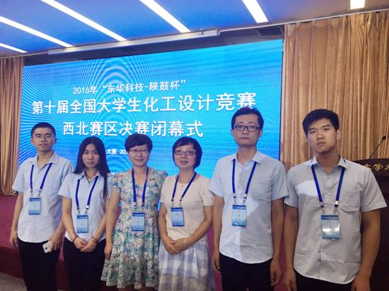 2016年8月5日至6日,由中国化工学会、中国化工教育协会、教育部高等学校化学工程与工艺专业教学指导分委员会联合主办的2016“东华科技-陕鼓杯”第十届全国大学生化工设计竞赛西北赛区决赛在山西科技大学隆重举行,我校环化学院共有三支参赛队伍,历经4个多月的准备,在最终比赛中,其中化工系赵亚梅副教授指导的由13级化工专业学生俞宗廷、贾建慧、赵宸、陈益利和李伟松五位同学组成的supersonics参赛队,从西北赛区40所高校(共计166件作品)中脱颖而出,获得了全国二等奖1项与西北赛区二等奖1项,这也是我校连续3年获此奖项。