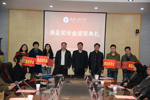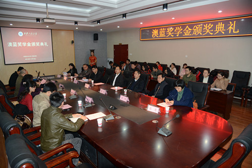 组织举办的“澳蓝”奖学金颁奖典礼在金花校区第三会议室举行。出席颁奖典礼的有澳蓝(福建)实业有限公司董事长黄华铃先生、我校副校长黄翔、研究生部主任万明、学生处副处长张慧、海角网