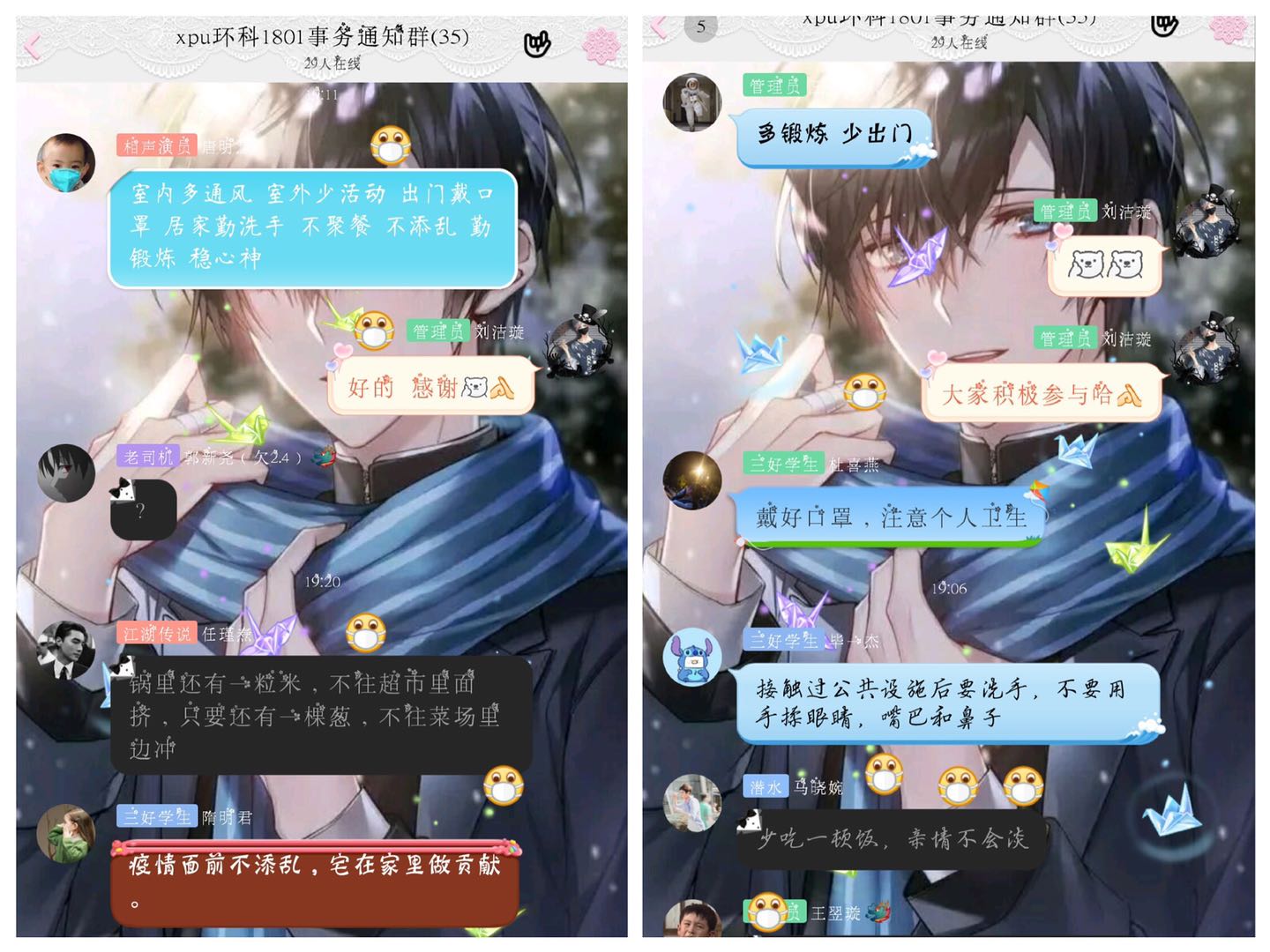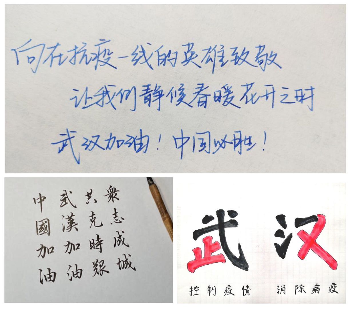 强化思想引领,筑牢抗疫防线。学院充分发挥网络育人优势,强化学生思想引领。一是通过视频会议等方式,带领学生学习我校疫情防控期间各项通知要求、《教育部致大学生的一封信》等,引导学生科学防疫,增强责任意识;二是辅导员、班主任加入学生课程学习群,协助任课老师督促学生按时上课,并组织线上“英语学习打卡”等活动,营造“好学、争先”的良好氛围,强化学习意识;三是通过微信公众平台、QQ群、微信群等方式发送疾病预防的方法和手段,告诫学生严格遵守当地政策,不出门、少出门,切实提高学生安全意识;四是组织各团支部开展以“疫情防控,从我做起”、“致敬最美逆行者”为主题的线上班团活动,鼓励学生参加第二课堂阅读活动。学院学生创作了主题文章、绘画、手幅寄语、《武汉伢》等抗疫相关文化产品,致敬抗疫英雄,助力抗疫一线,增强战胜疫情的坚定信心。