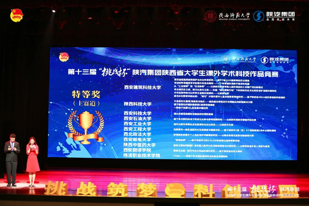 学生在科技创新方面再创佳绩,荣获陕西省第十三届“挑战杯”大学生课外学术科技作品竞赛主赛道特等奖1项、二等奖1项,并代表学校参加今年下半年在四川大学举行的第十七届“挑战杯”全国大学生课外学术科技作品竞赛决赛。