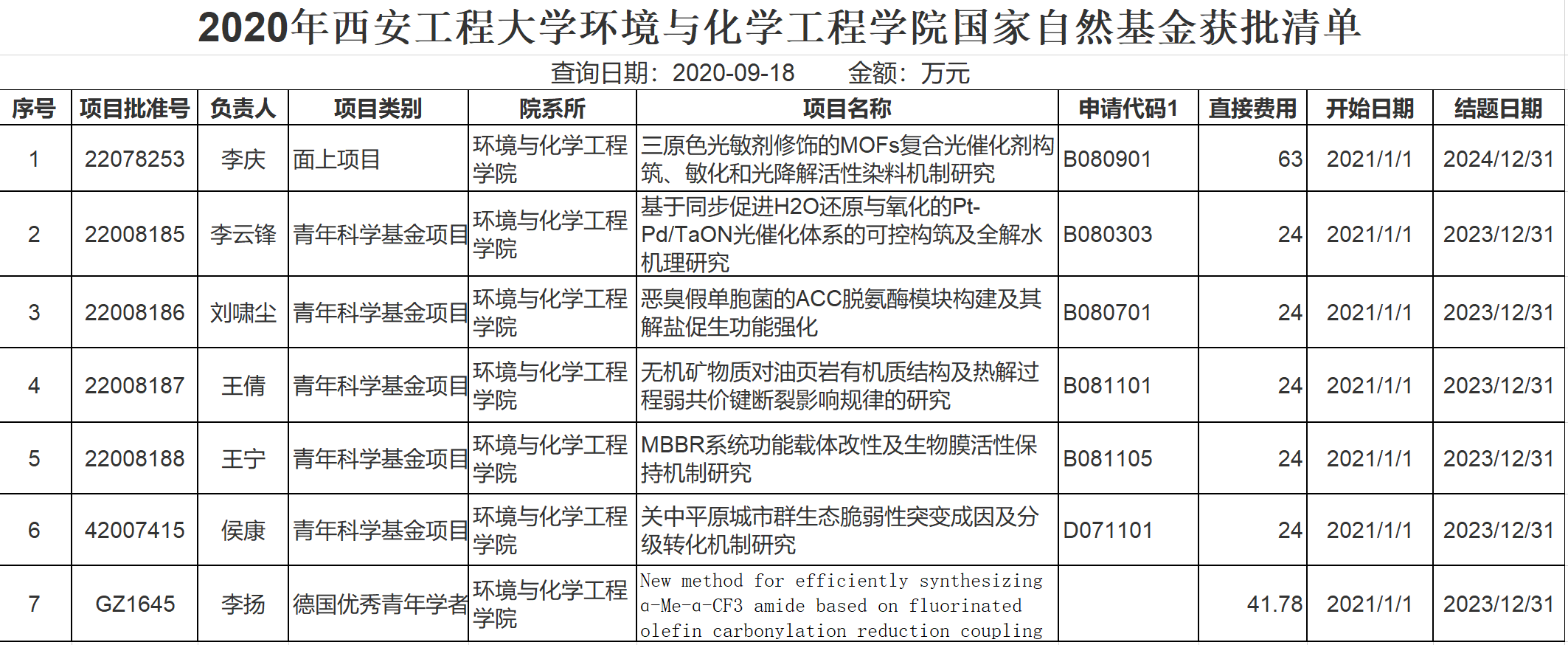 近日,国家自然科学基金委公布了2020年国家自然科学基金立项名单,海角网 共有7项研究项目立项,研究经费共计224.78万元,实现了历史突破。