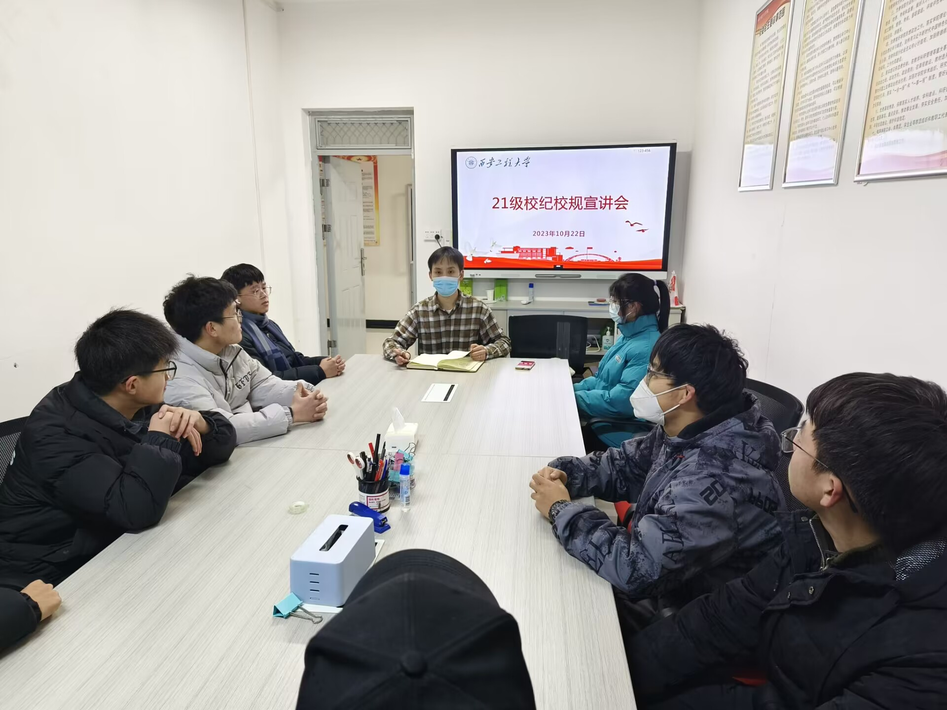 张易泽向同学们普及了学校的相关常规、宿舍管理条例、学生行为准则等内容。通过通俗易懂的例子,向同学们讲述了校规校纪对于个人发展的重要意义,要求同学们要时刻遵守纪律,提高个人道德水平,营造良好的校园生活氛围。