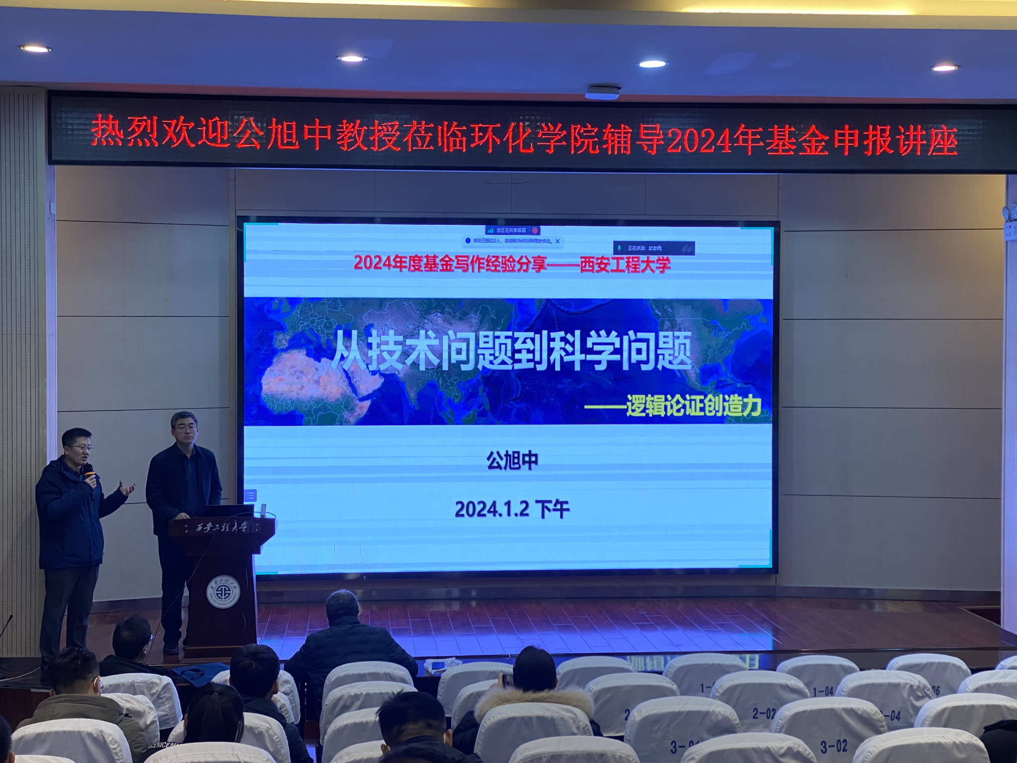 特邀中国科学院过程工程研究所公旭中教授作题为“从技术问题到科学问题——逻辑论证创造力”的国家基金申报辅导讲座。学院2024年国家基金申报教师及科研骨干五十余人线上线下同步参加。讲座由主持工作副院长武占省教授主持。